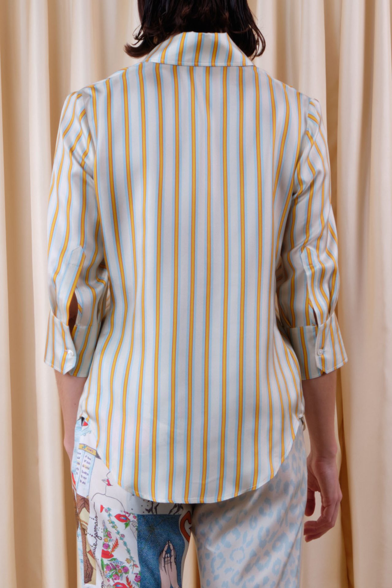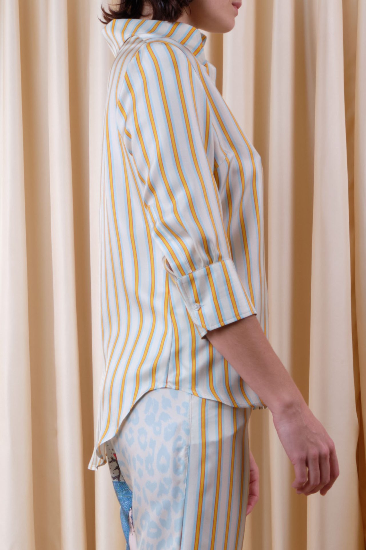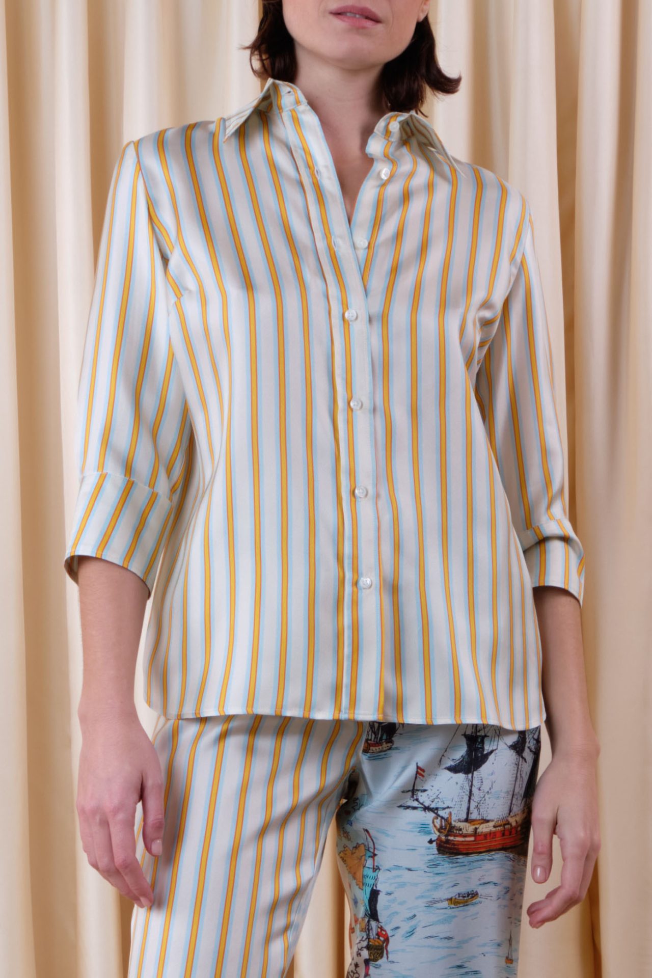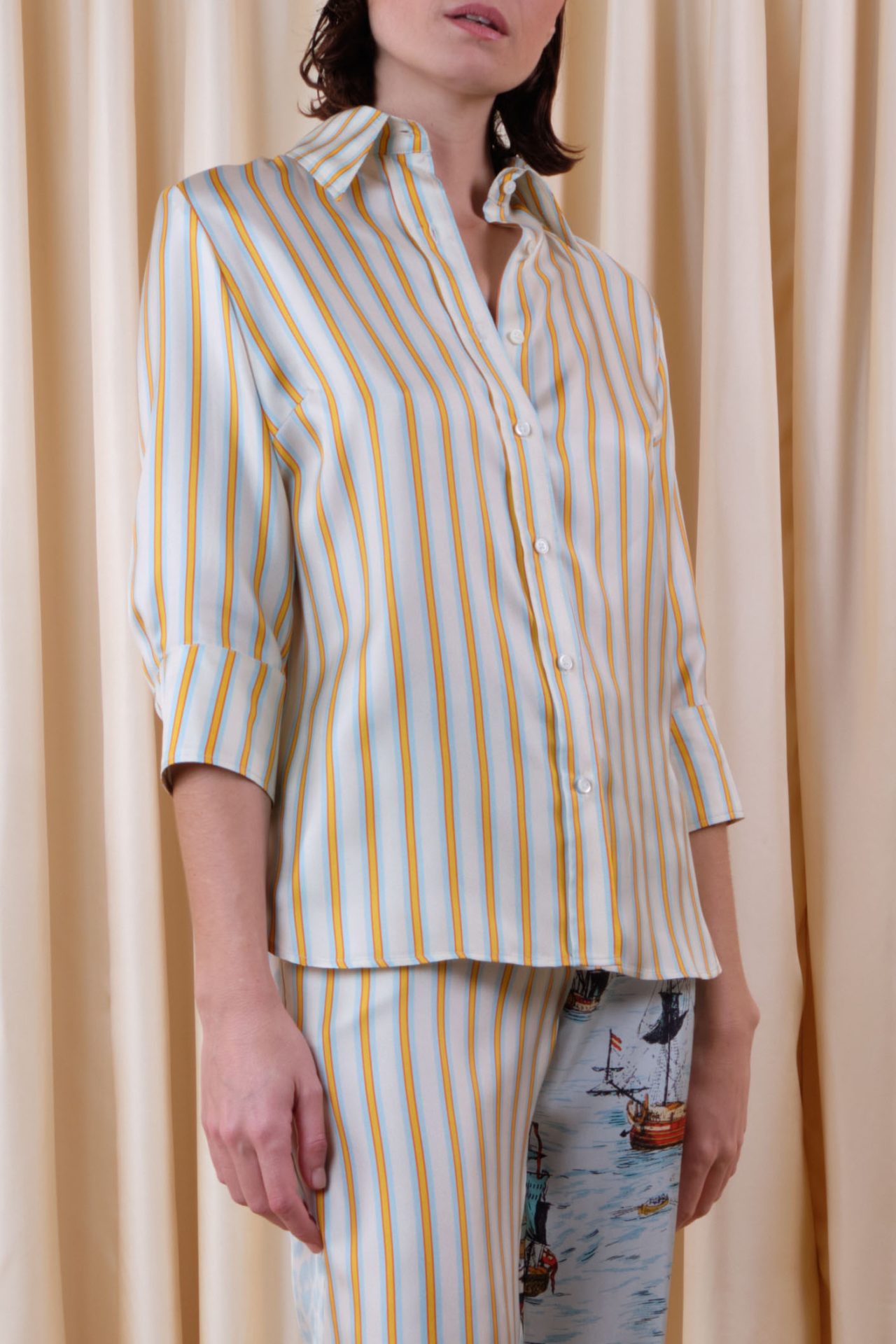 Medium-sleeved skinny shirt in silk twill, fully buttoned, with 70’s point collar. Exclusive print “Prestic Stripes”.