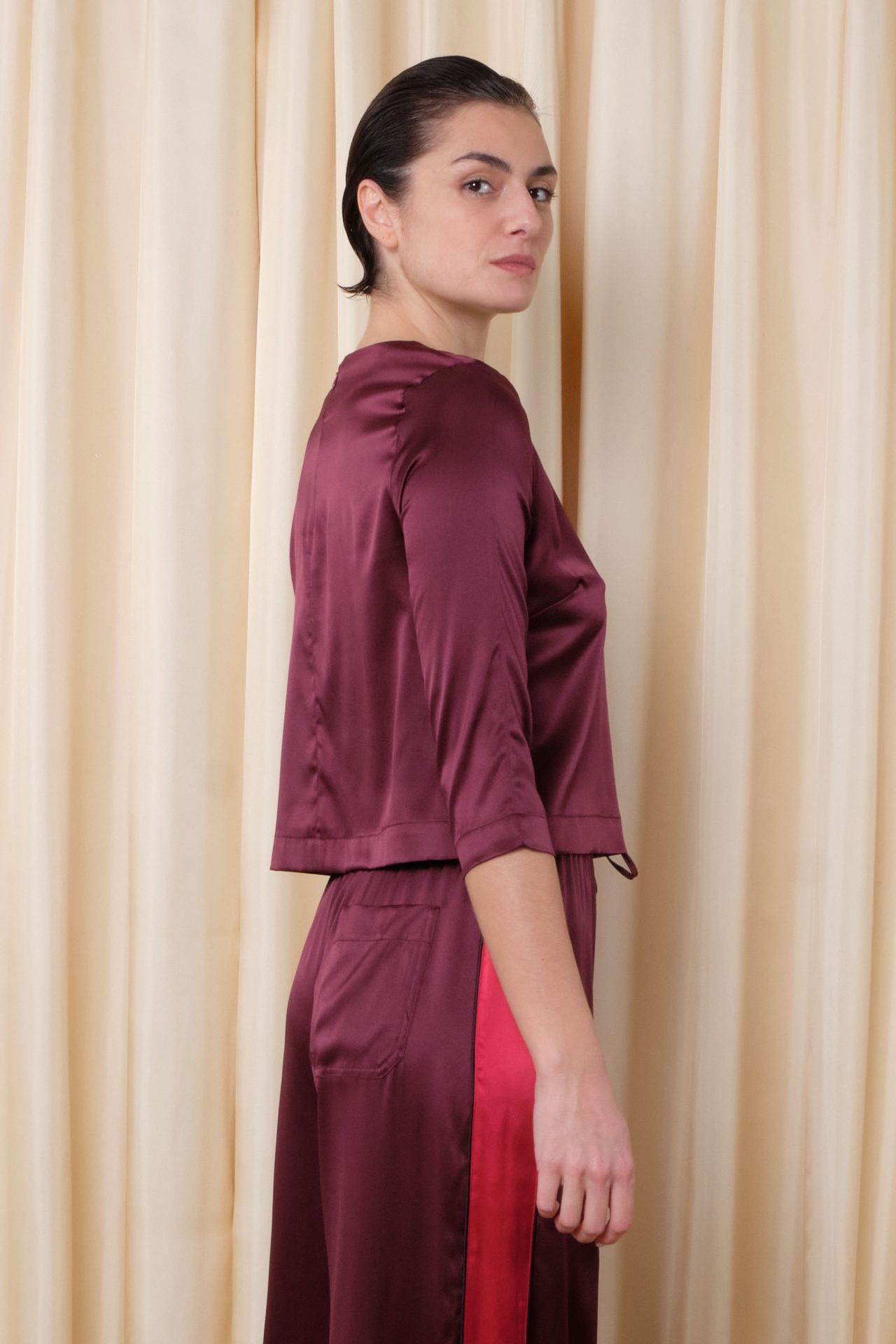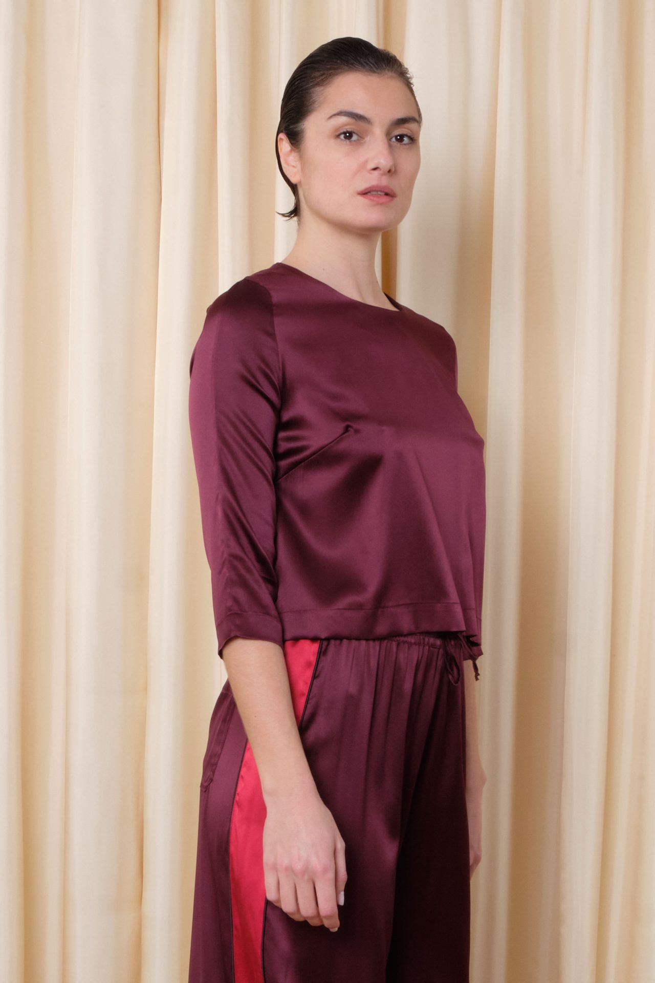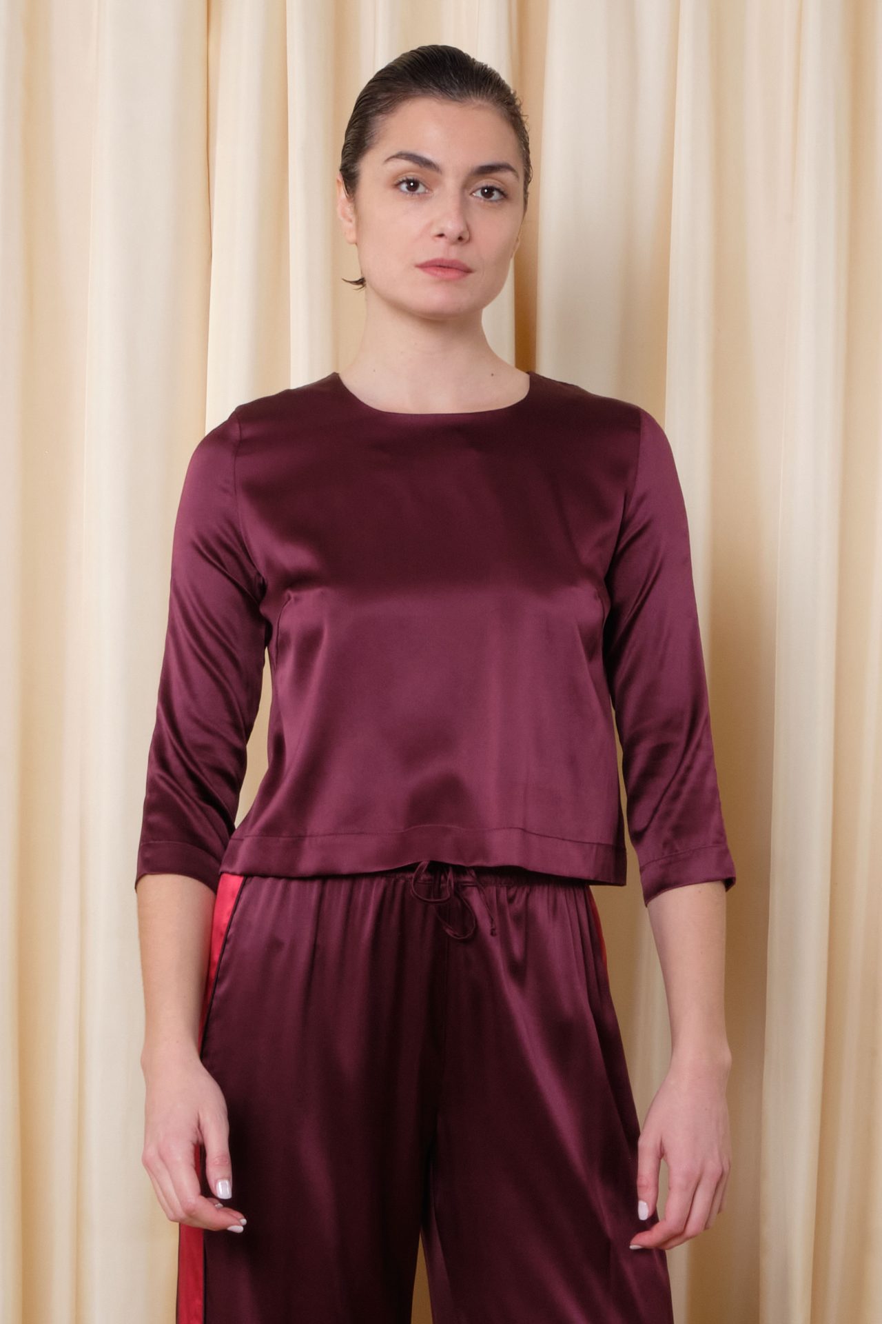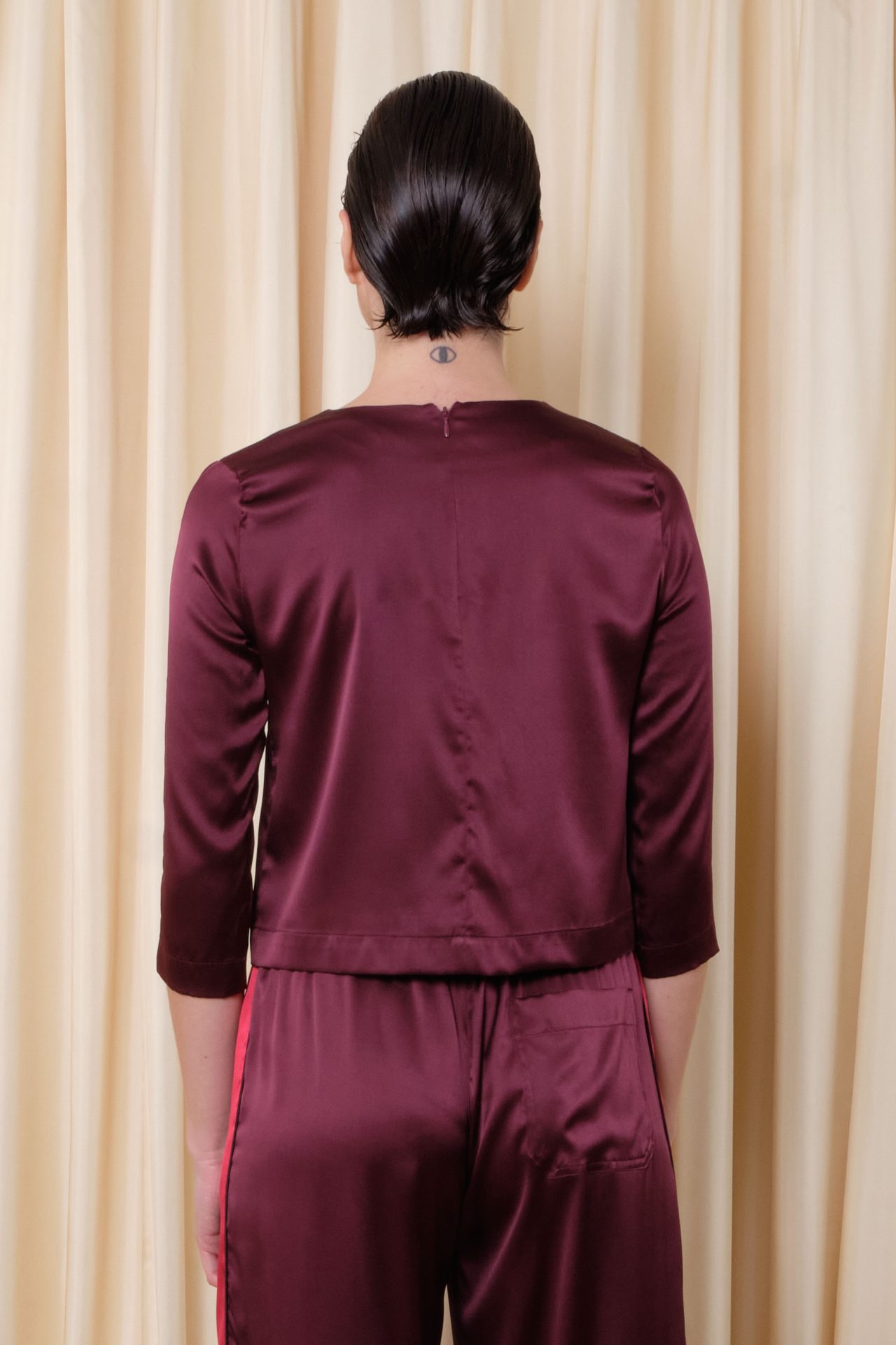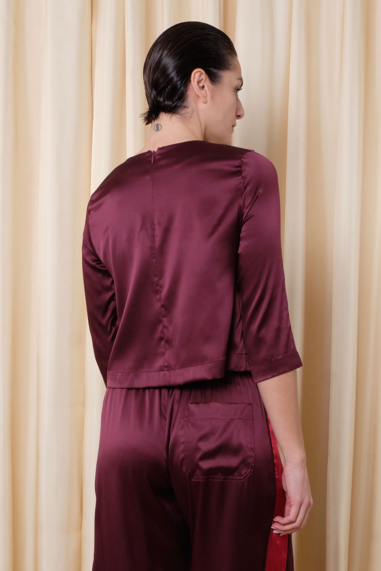 Top à manches longues, tout en satin de soie stretch, fermeture zip dans le dos.