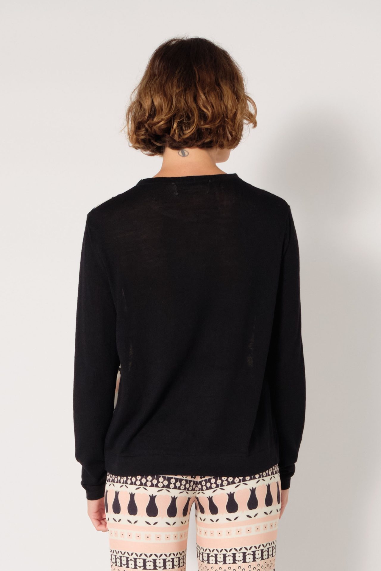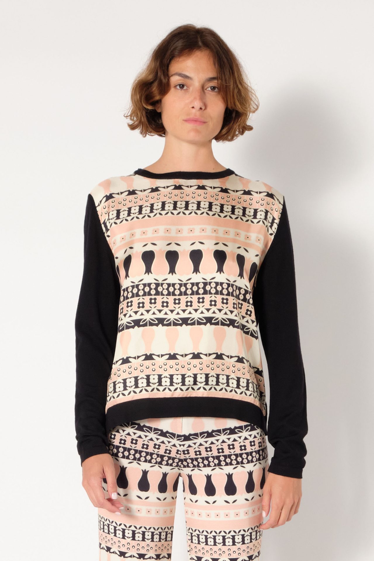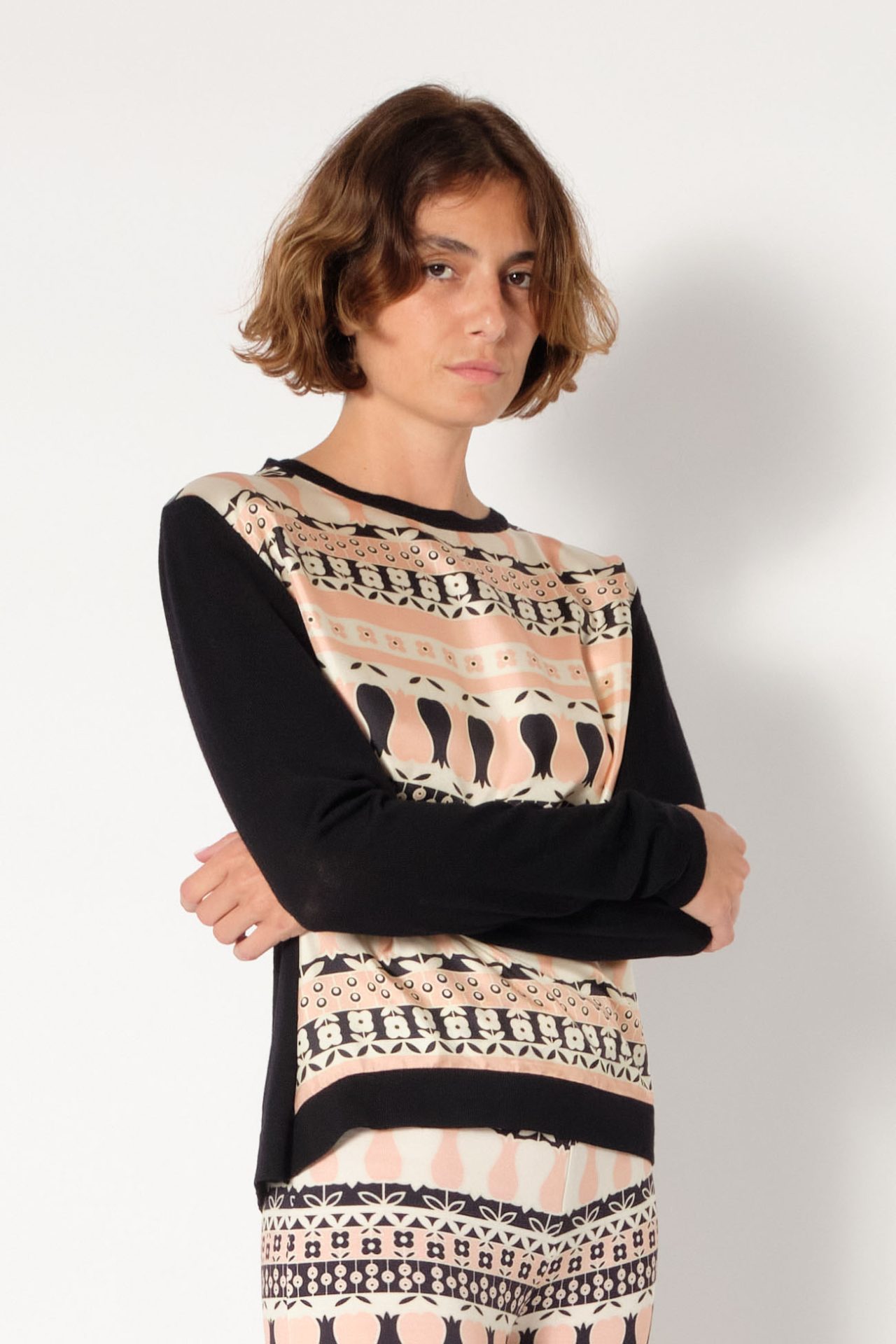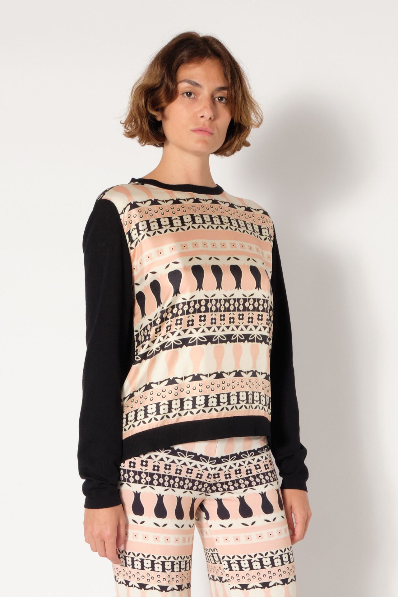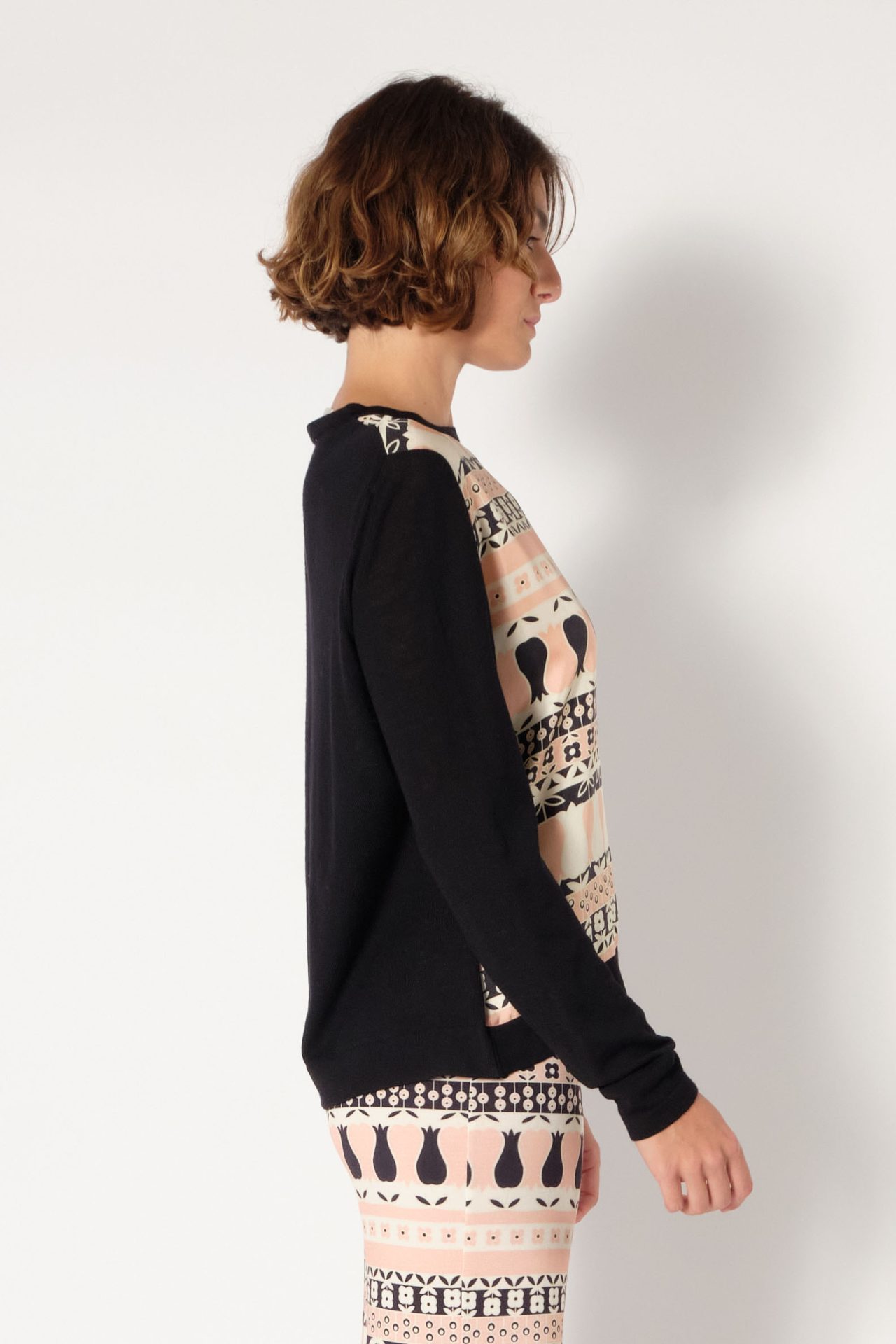 Round neck pullover in wool, long sleeves, front in silk twill. Exclusive print “Tulips”.