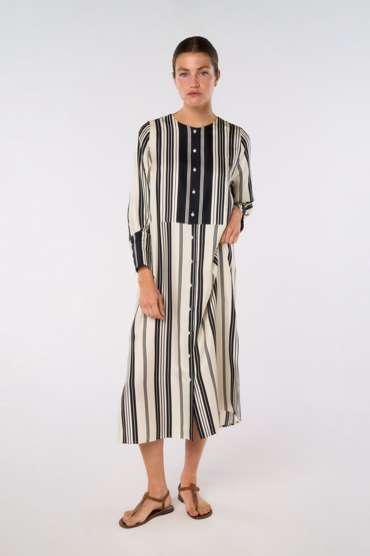 Midi dress in twill silk with a dickey, fully buttoned, long sleeves and wide buttoned wrists, slits on both sides, mother-of-pearl buttons. Exclusive print “Mattress Stripes” in two colors.
