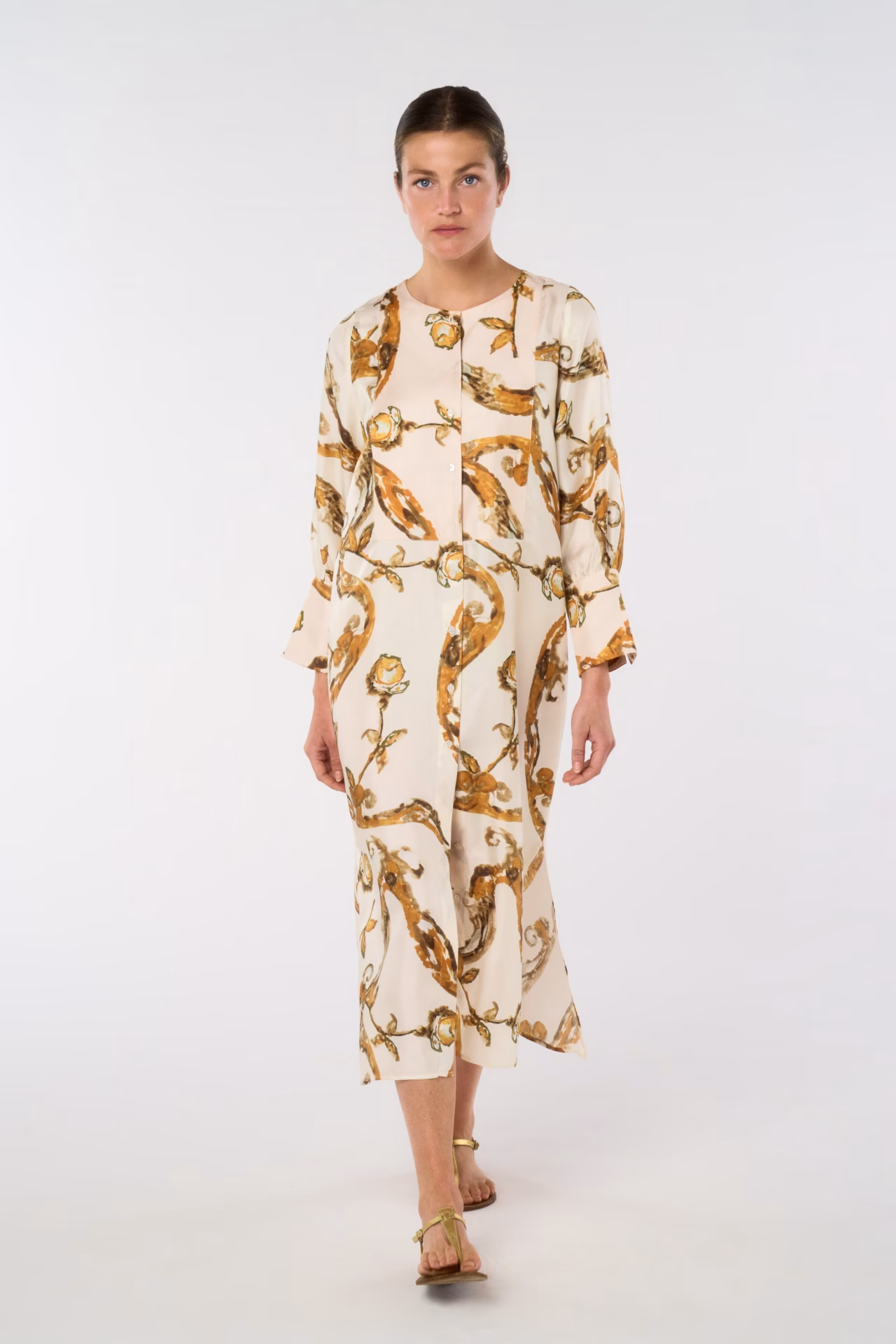 Midi dress in twill silk with a dickey, fully buttoned, long sleeves and wide buttoned wrists, slits on both sides, mother-of-pearl buttons. Exclusive print “Roseraie” in two colors.