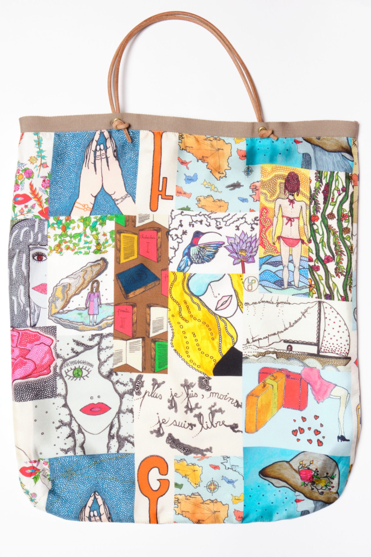 Small bag in silk twill fully lined in cotton, handles in leather cord, exclusive prints “Patchwork Loki” based on Laurence Kiberlain’s drawings and “Marinière stripes”.
