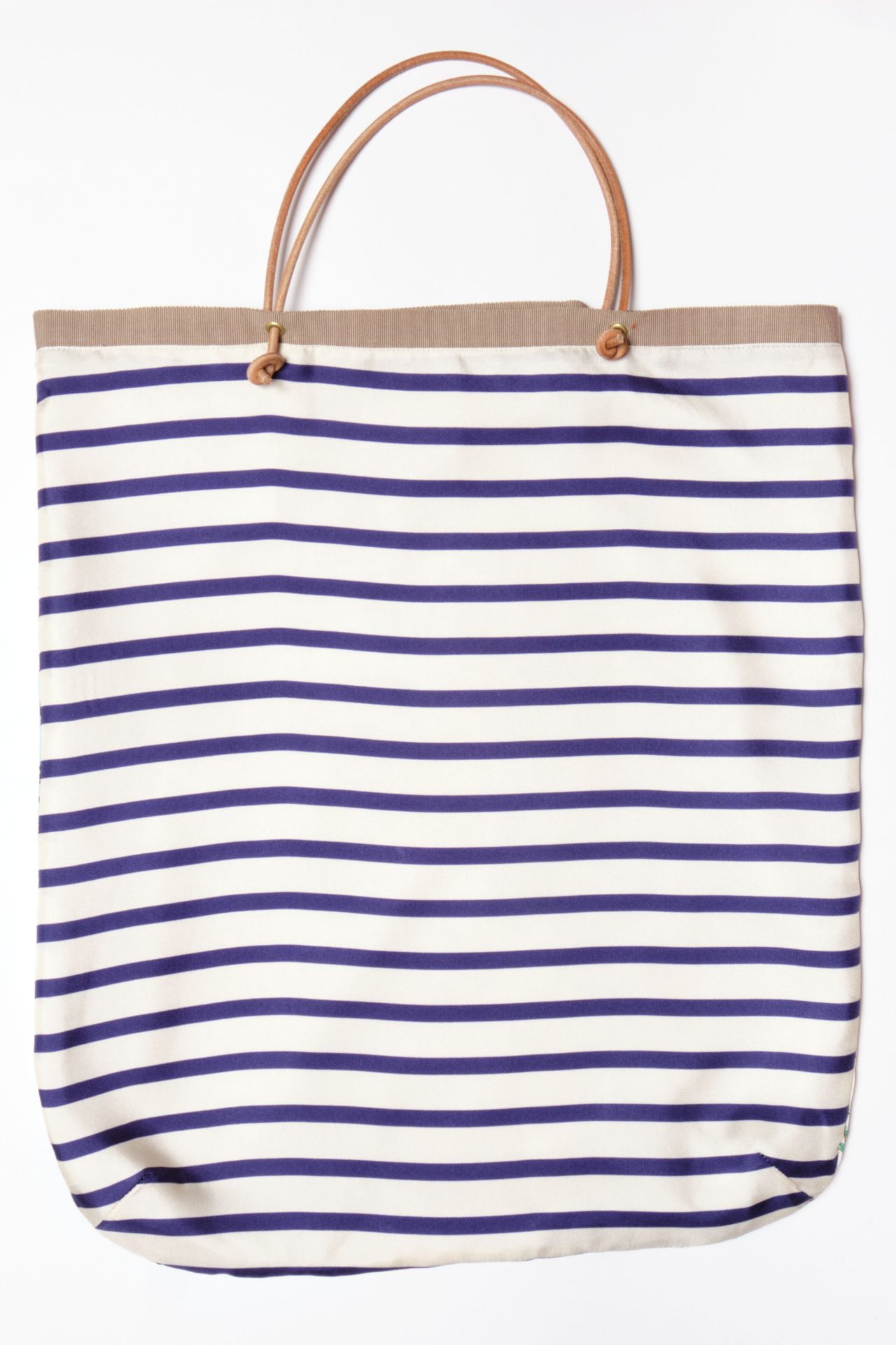 100% silk twill, 100% cotton lining, 100% leather cord handles.