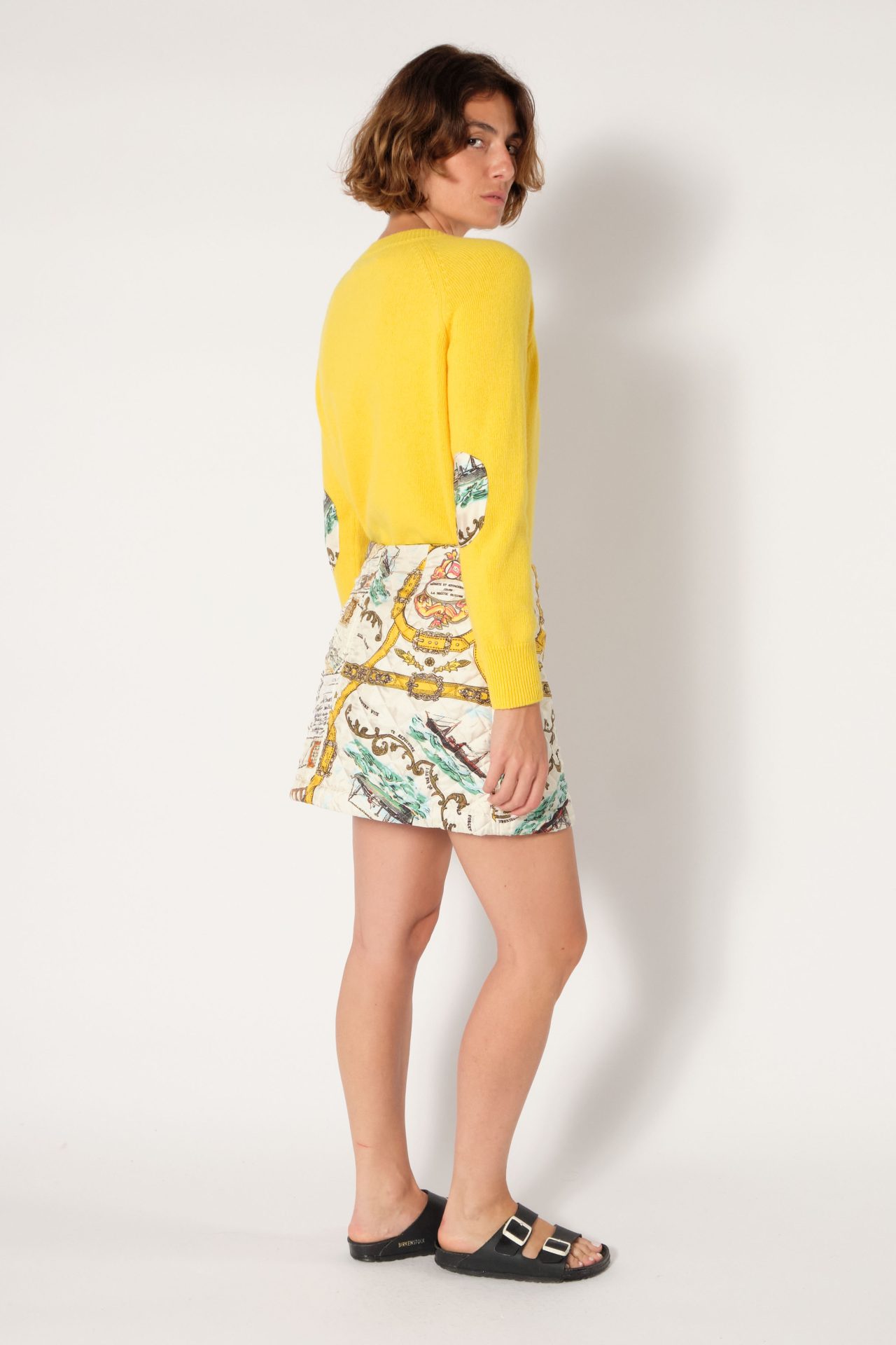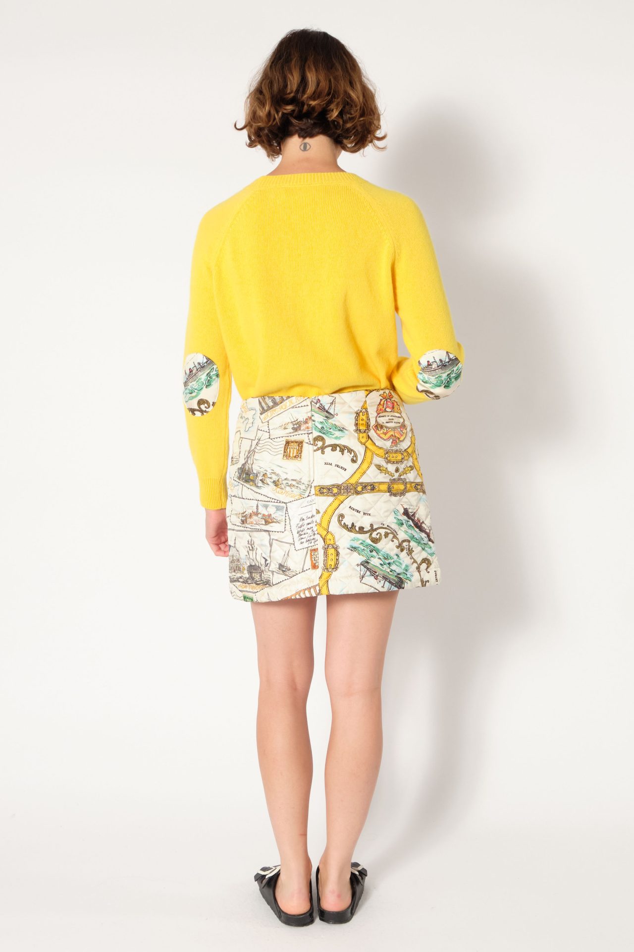 Mini quilted skirt, in silk twill, padding in polyester, zip fastening in the back. Exclusive prints “Attachement” and “Postal Cards”.