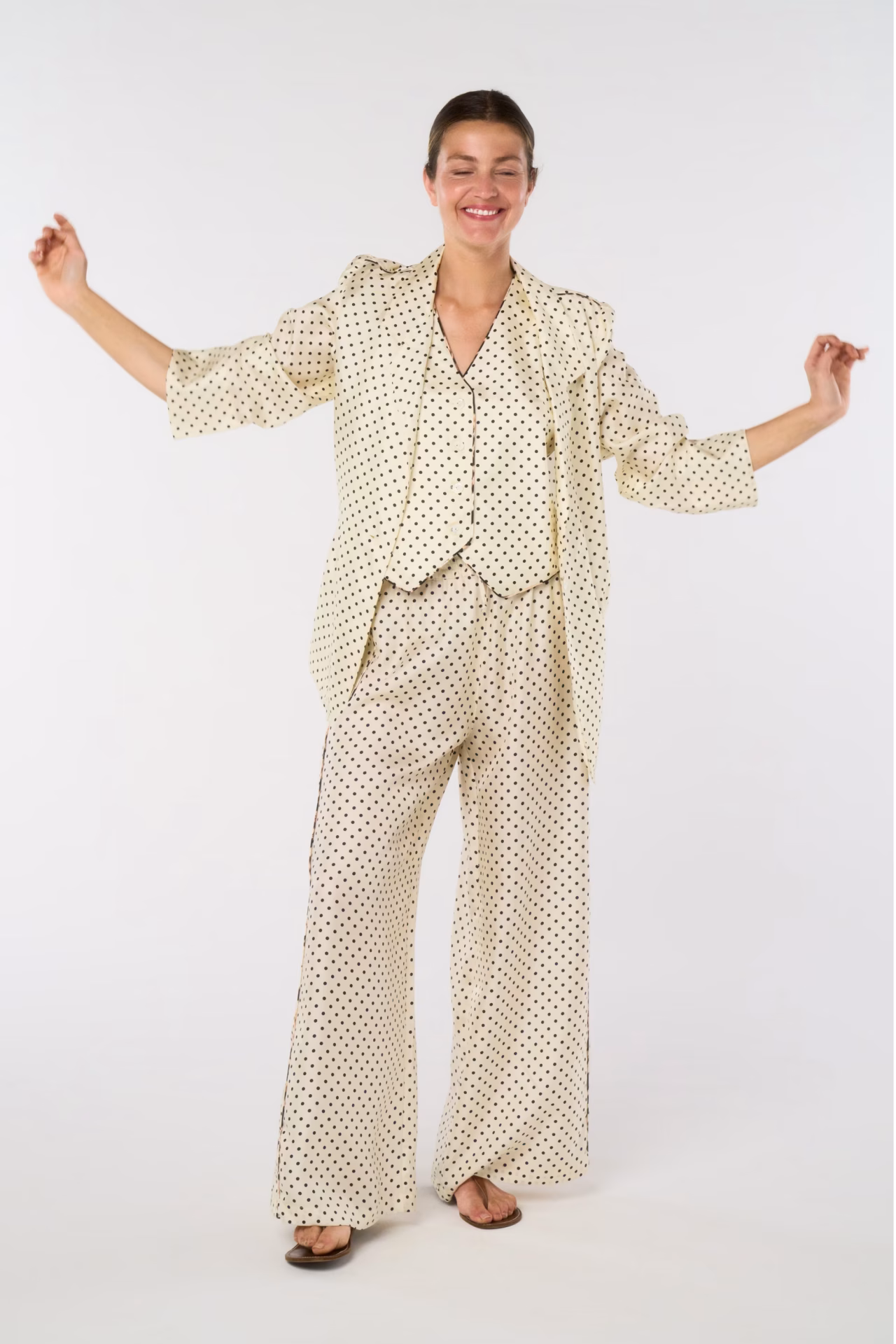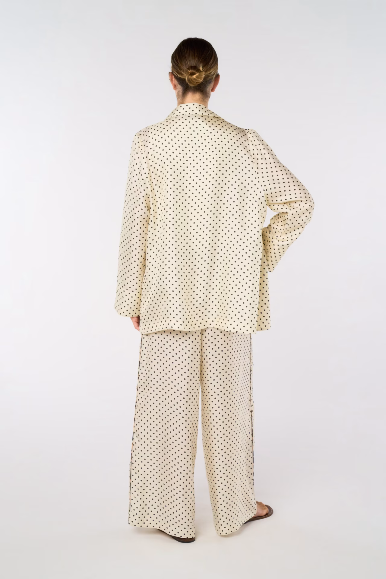 Loose-fitting jacket fully in silk twill, Panther silk twill piping details, two front pockets, and a mother-of-pearl button. Exclusive print “Polka Dots”.