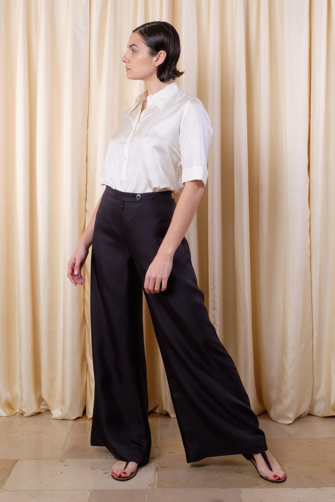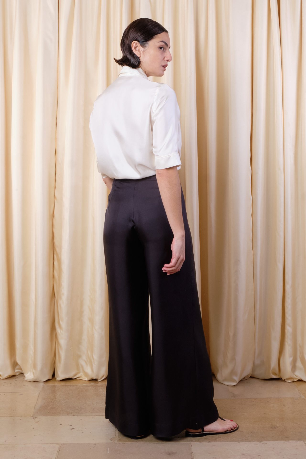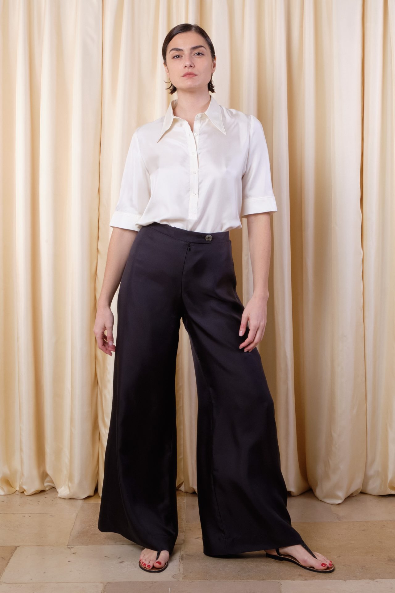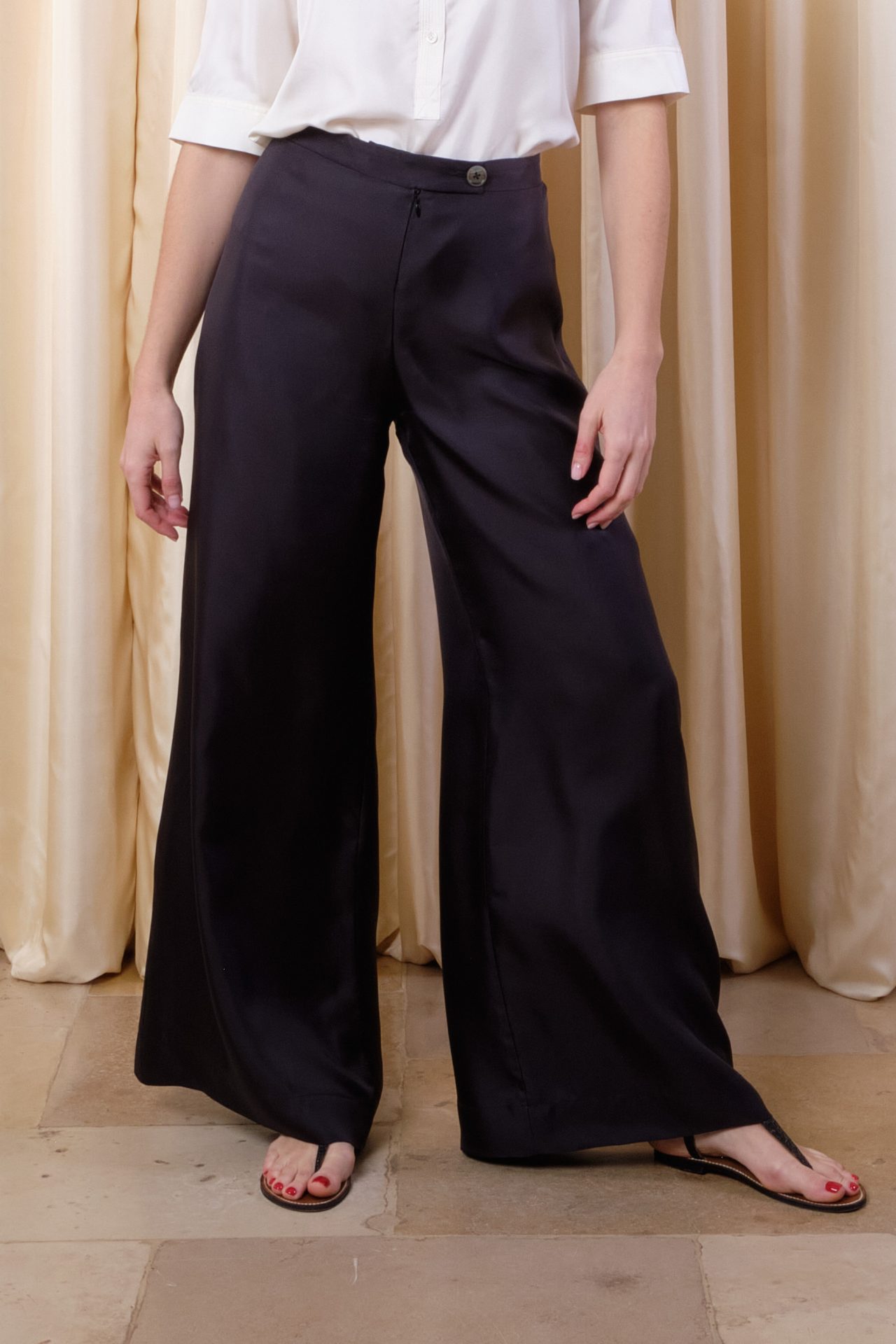 Natural-rise palazzo pants in silk twill with wide legs that flare out from the waist. Zip fastened & mother-of-pearl button on the front.