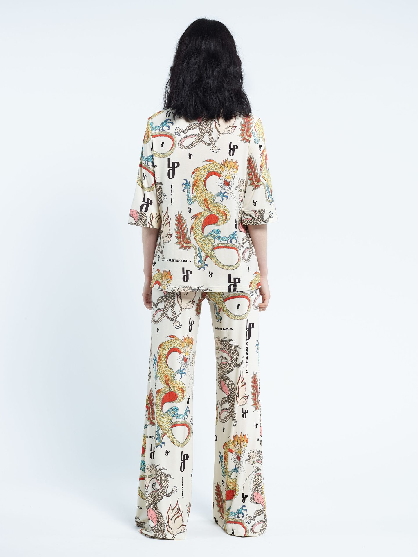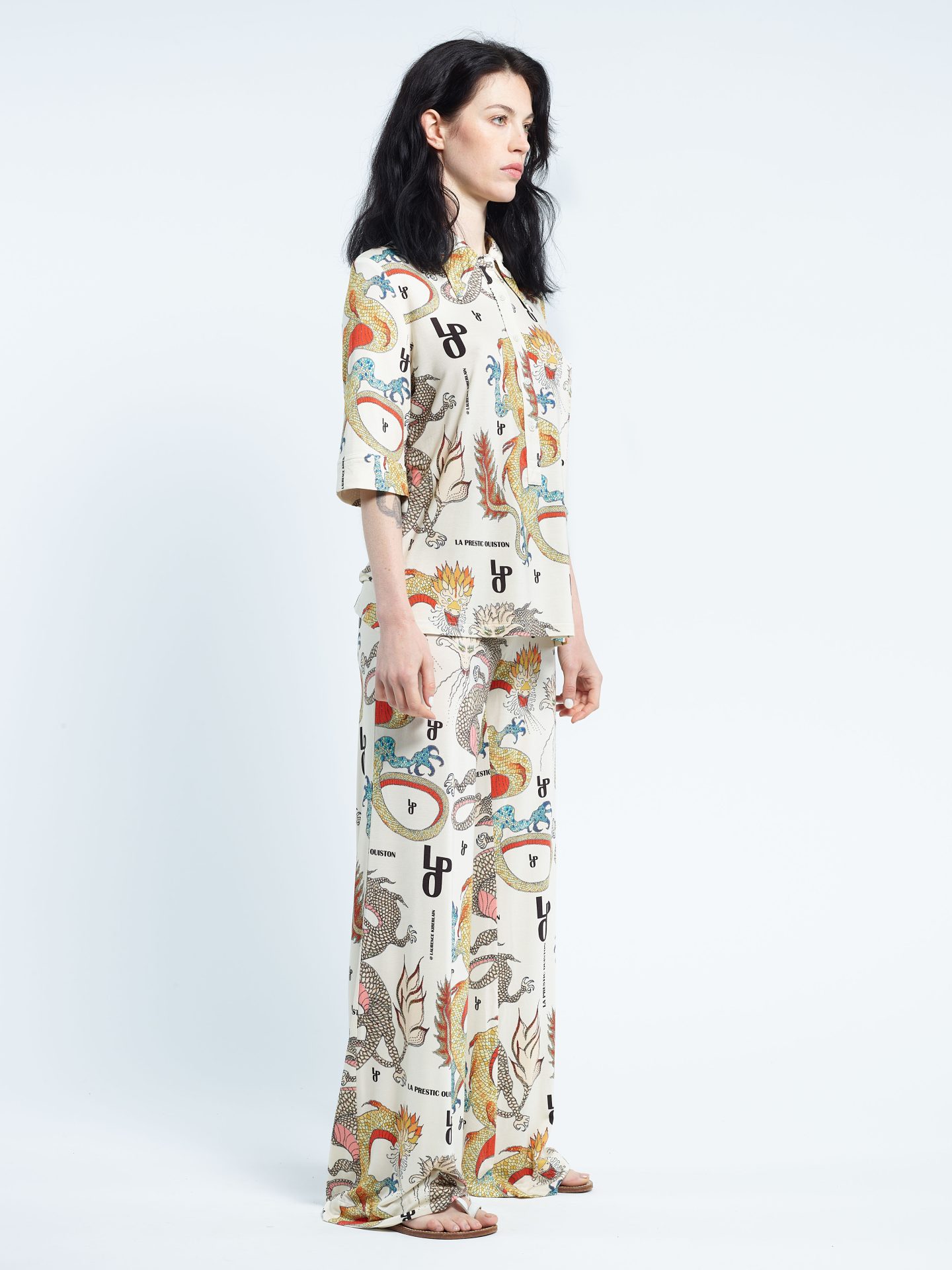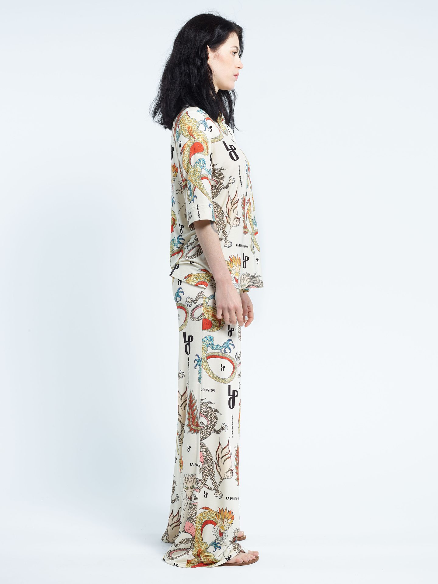 Natural-rise palazzo pants in viscose with wide legs that flare out from the waist. Zip fastened & mother-of-pearl button on the front. Exclusive print “Dragons” based on Laurence Kiberlain’s drawings.
