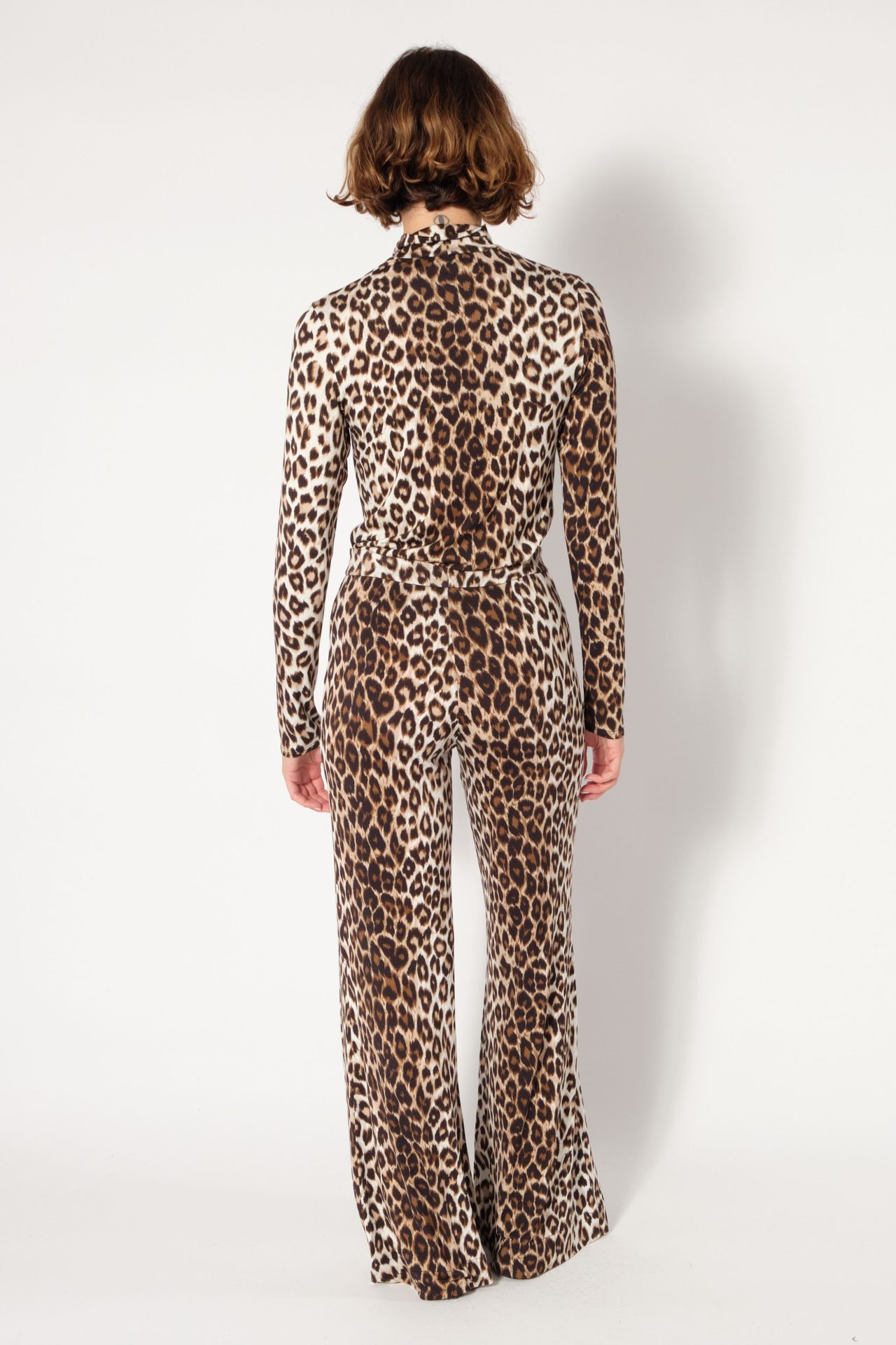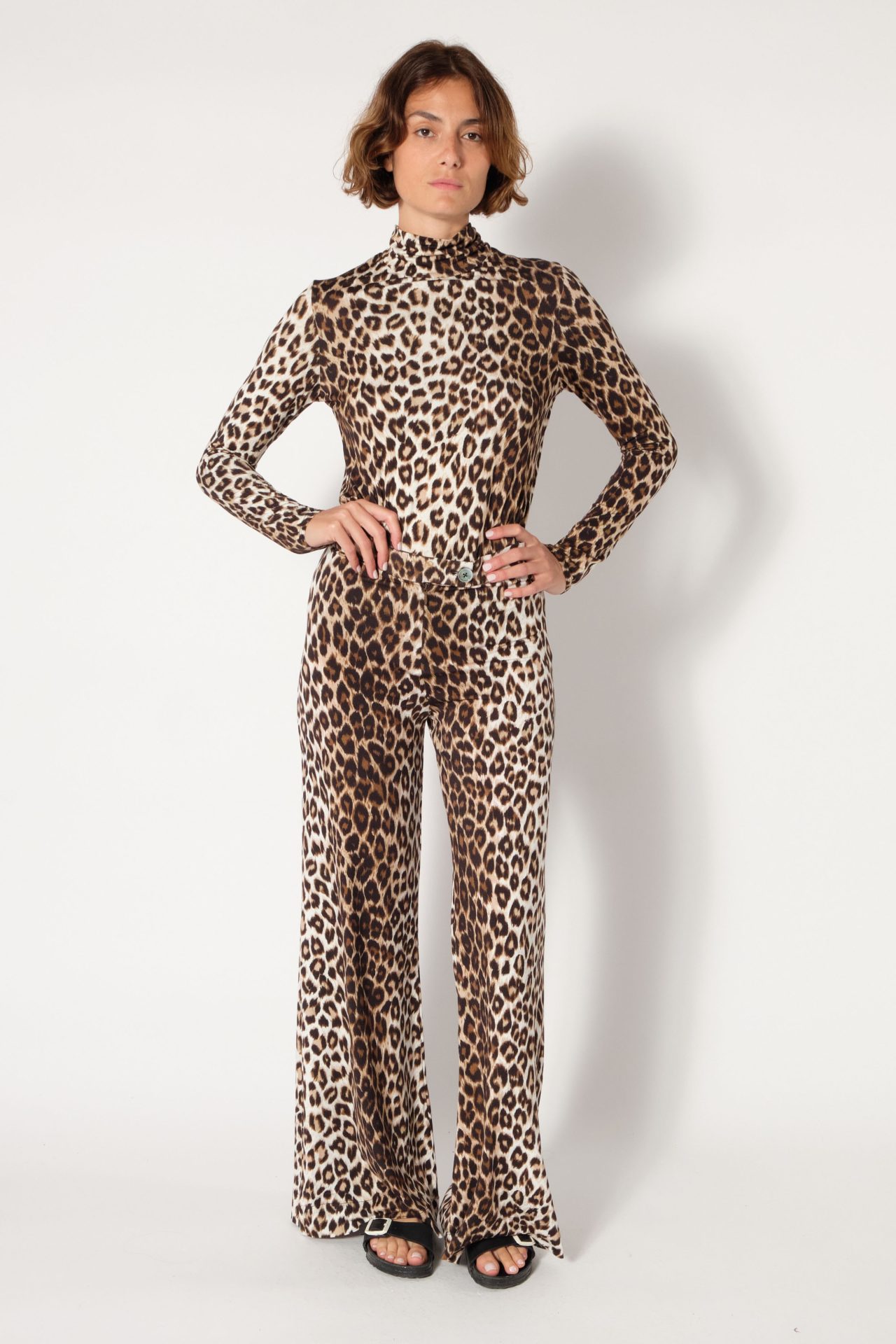 Natural-rise palazzo pants in viscose with wide legs that flare out from the waist. Zip fastened & mother-of-pearl button on the front. Exclusive print “Panther”.