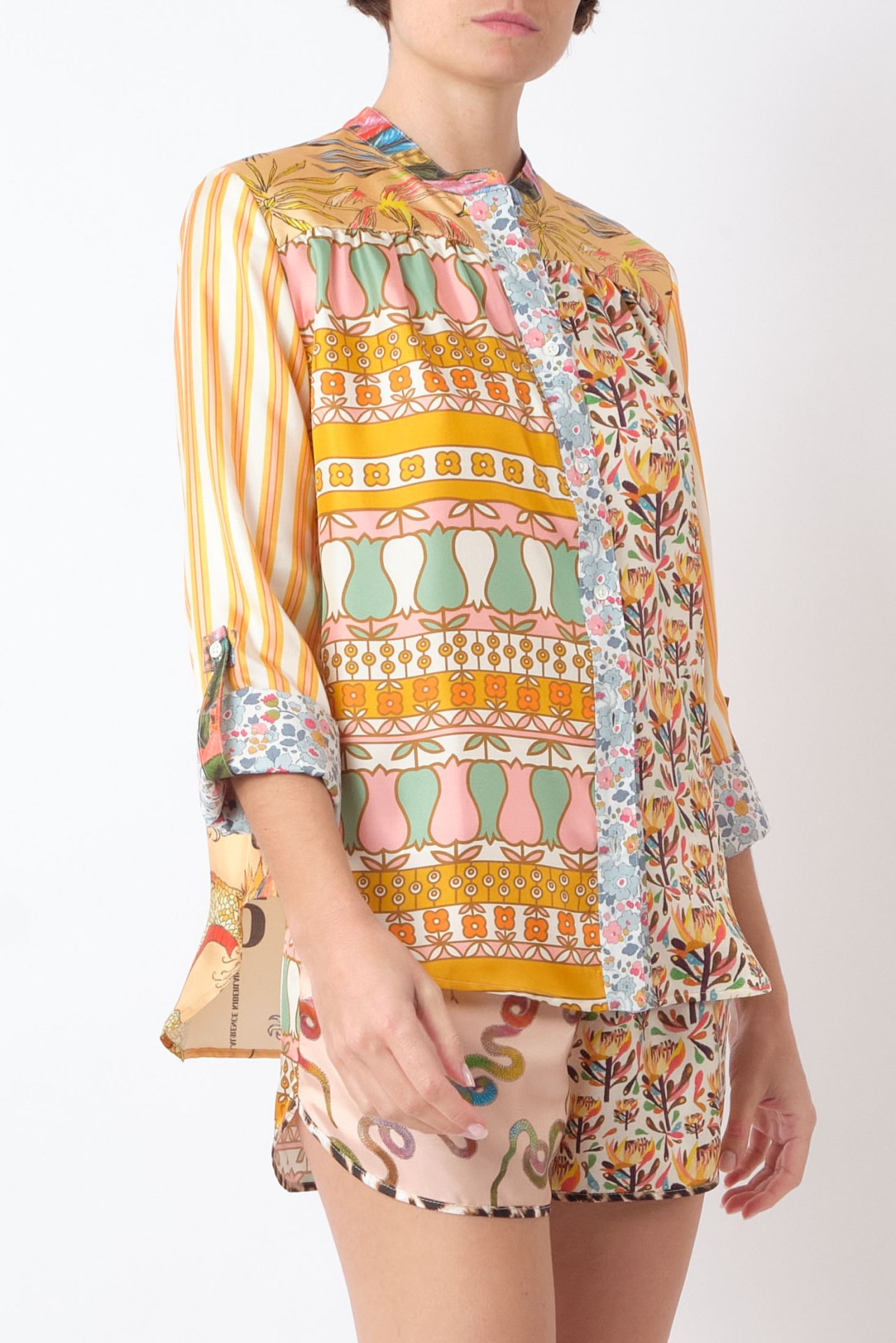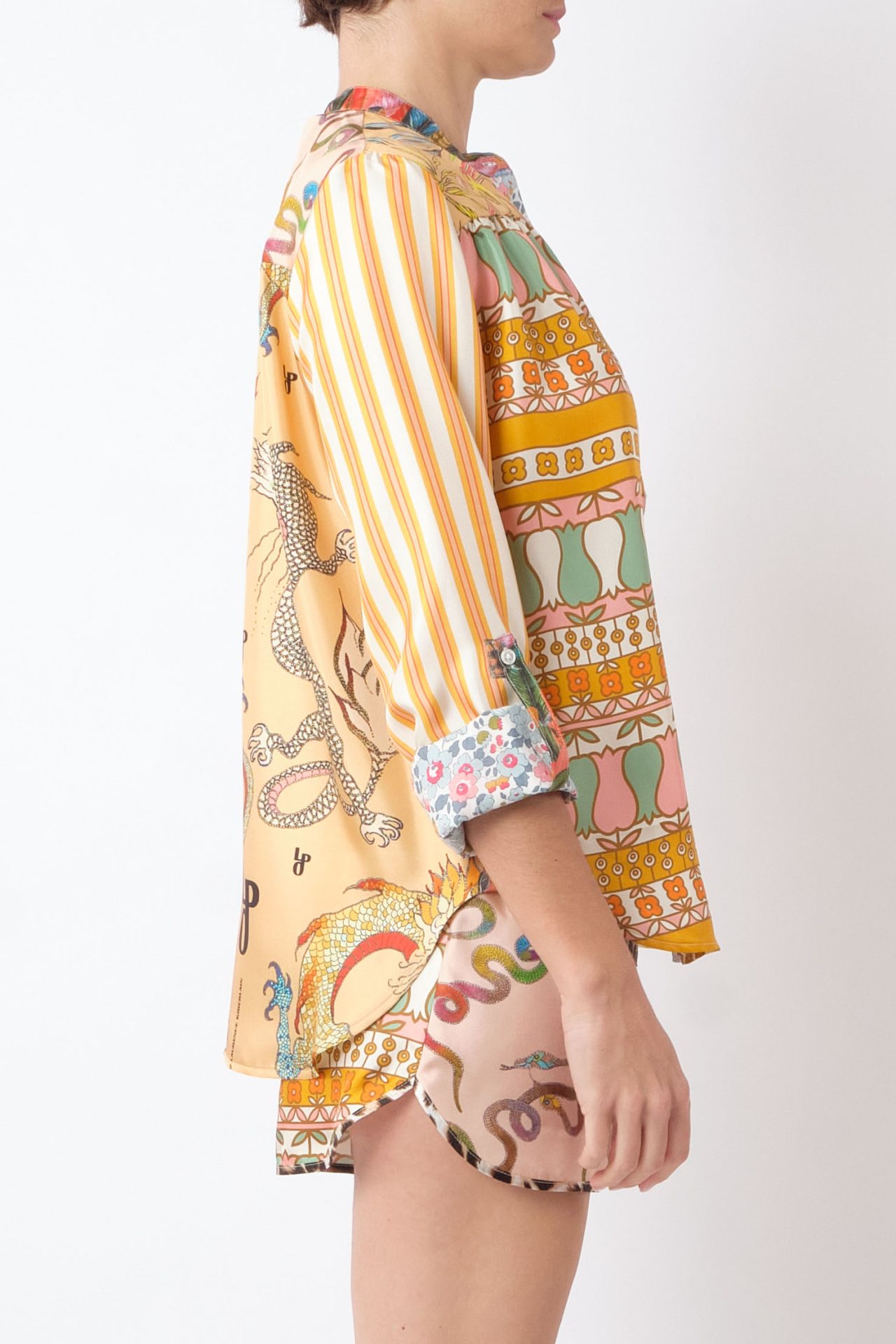 Long sleeved fully buttoned shirt with mao collar and yoke, in silk twill, and mother-of-pearl buttons. Exclusive prints “Dragons” based on Laurence Kiberlain’s drawings, “Malibu” based on Vanessa Atlan’s watercolours, “Peace” and “Tulips”, details in Liberty cotton.