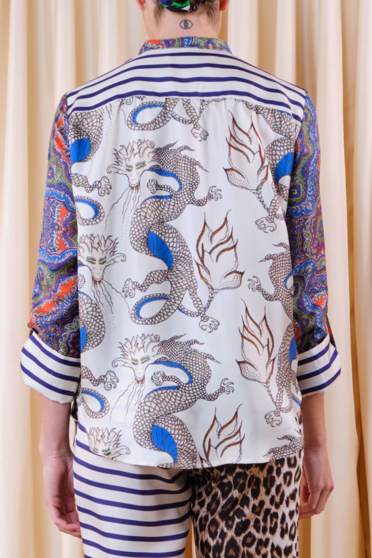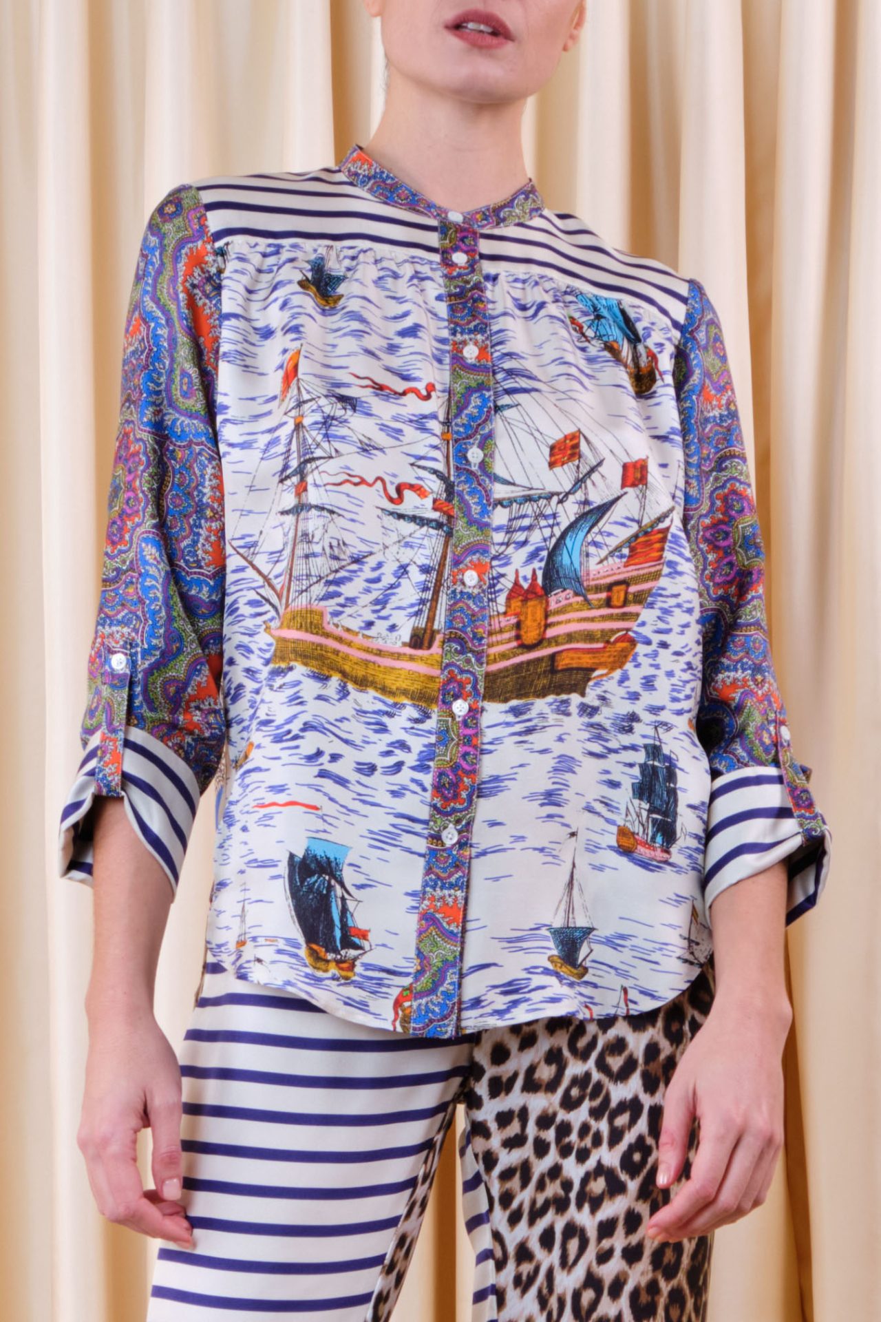 Long sleeved fully buttoned shirt with mao collar and yoke, in silk twill, and mother-of-pearl buttons. Exclusive prints “Dragonne” based on Laurence Kiberlain’s drawings on the back, “Caravelles”, “Delhi” et “Marinière”.