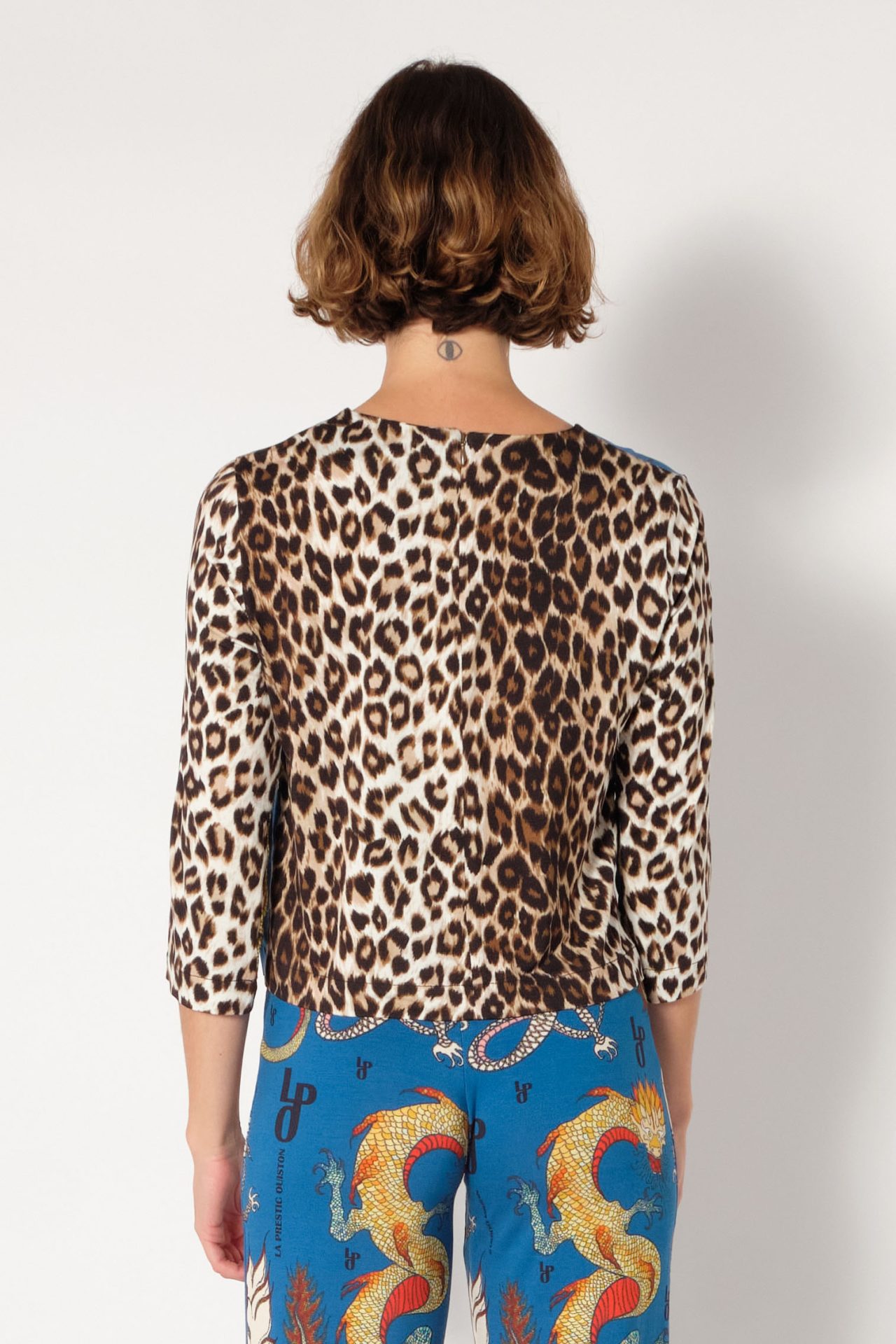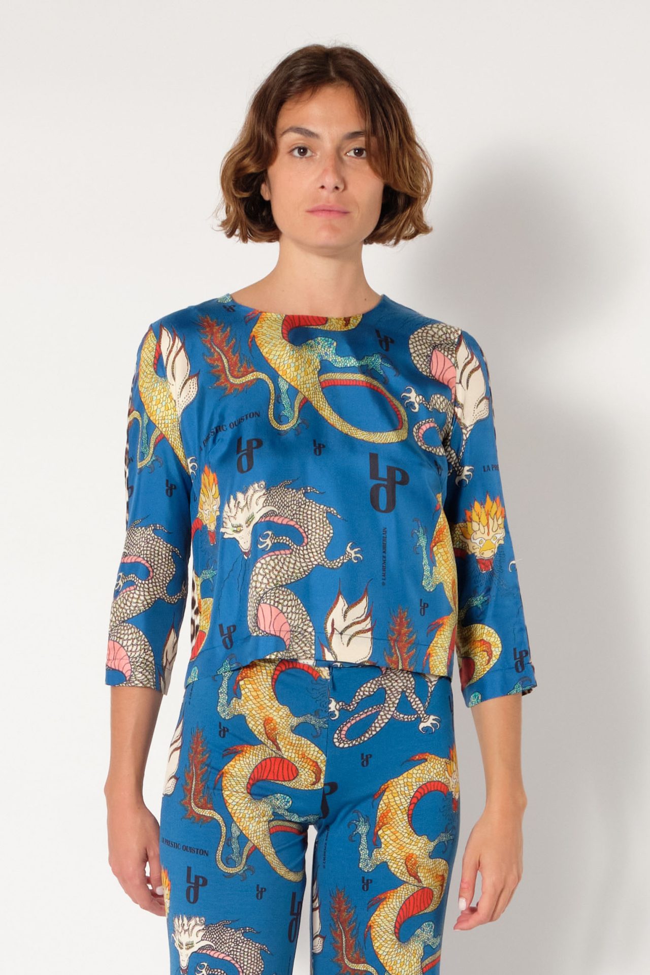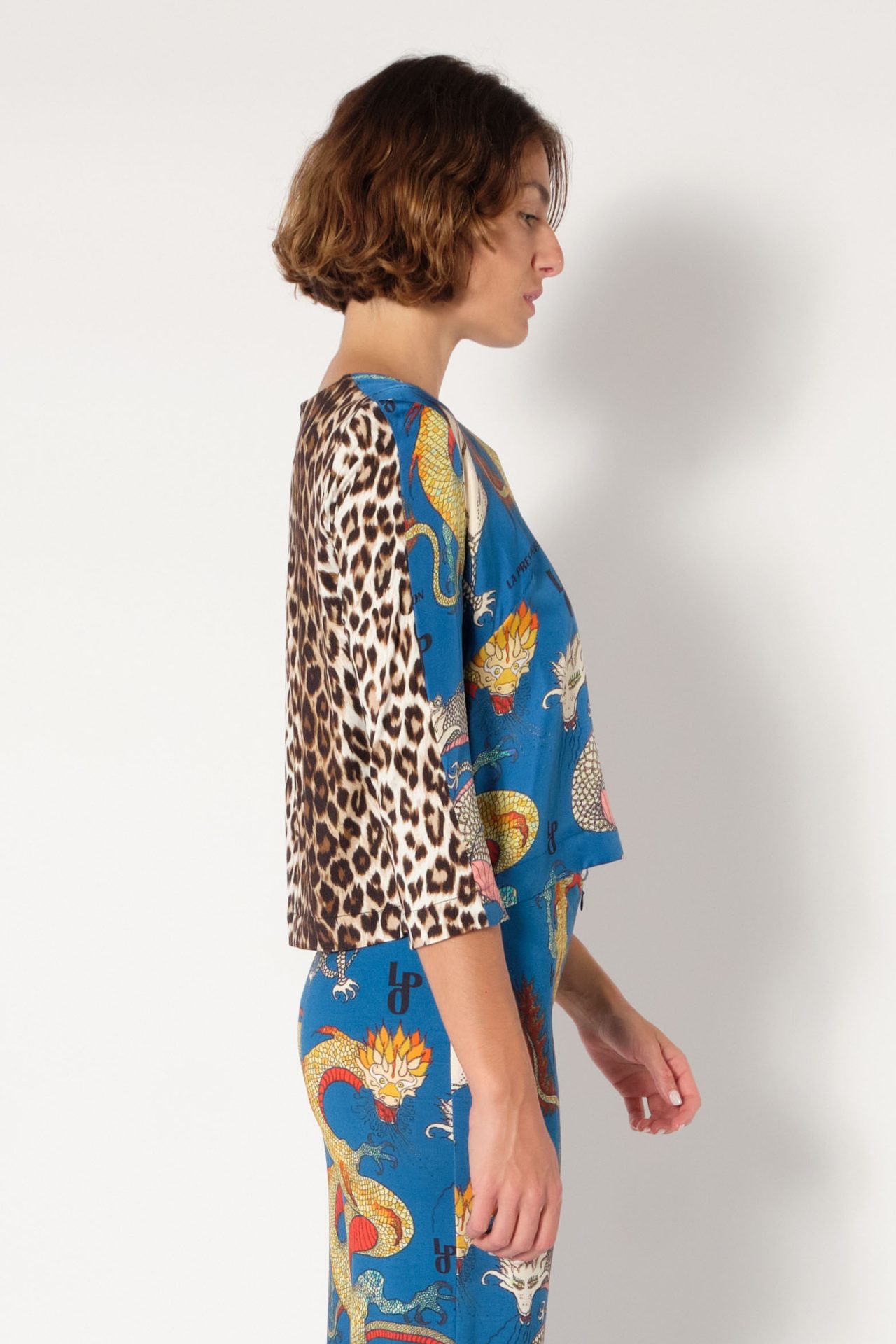 Long-sleeved two-prints top, silk twill in front, viscose jersey in the back with zip fastening. Exclusive prints “Dragons” based on Laurence Kiberlain’s drawings and “Panther”.