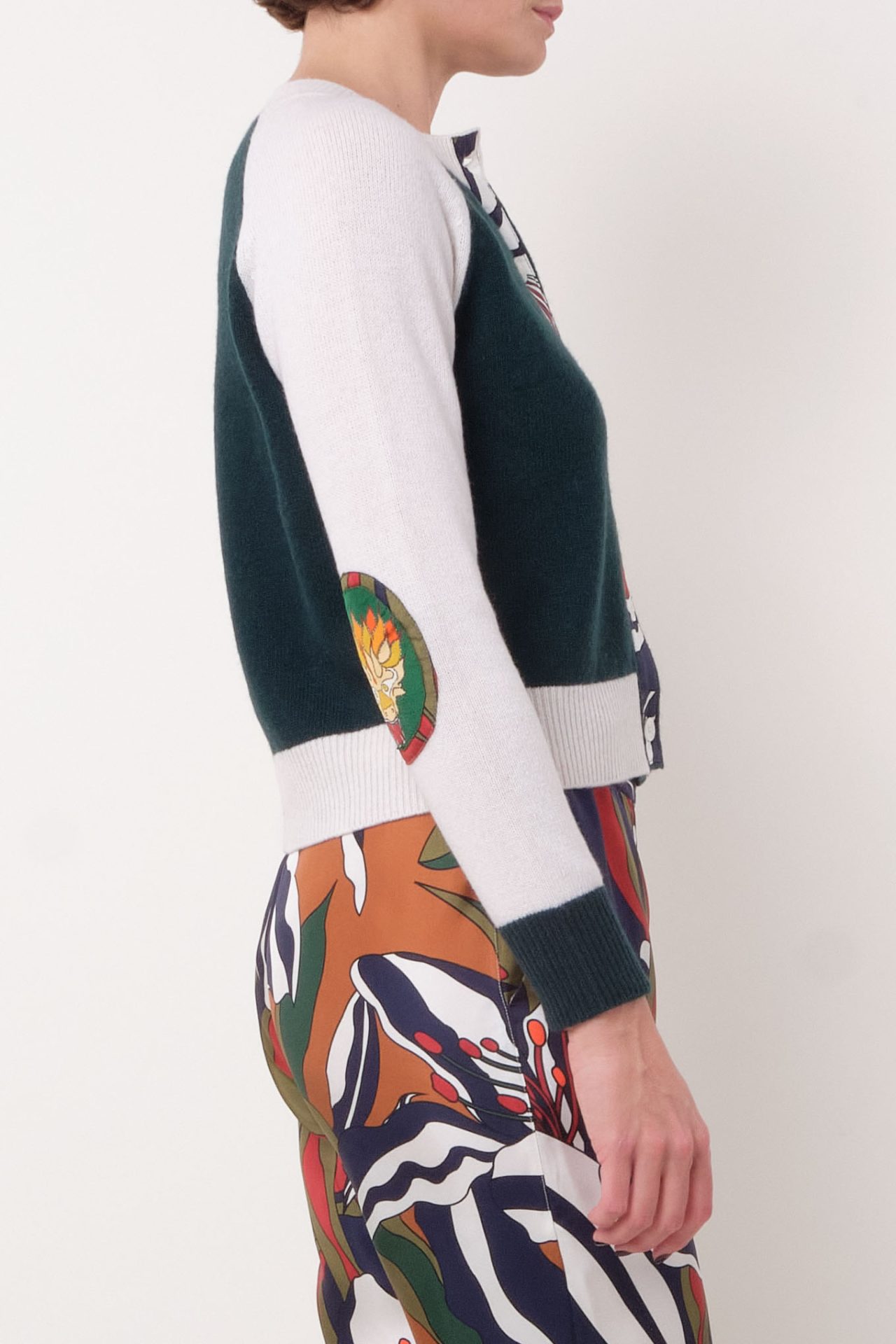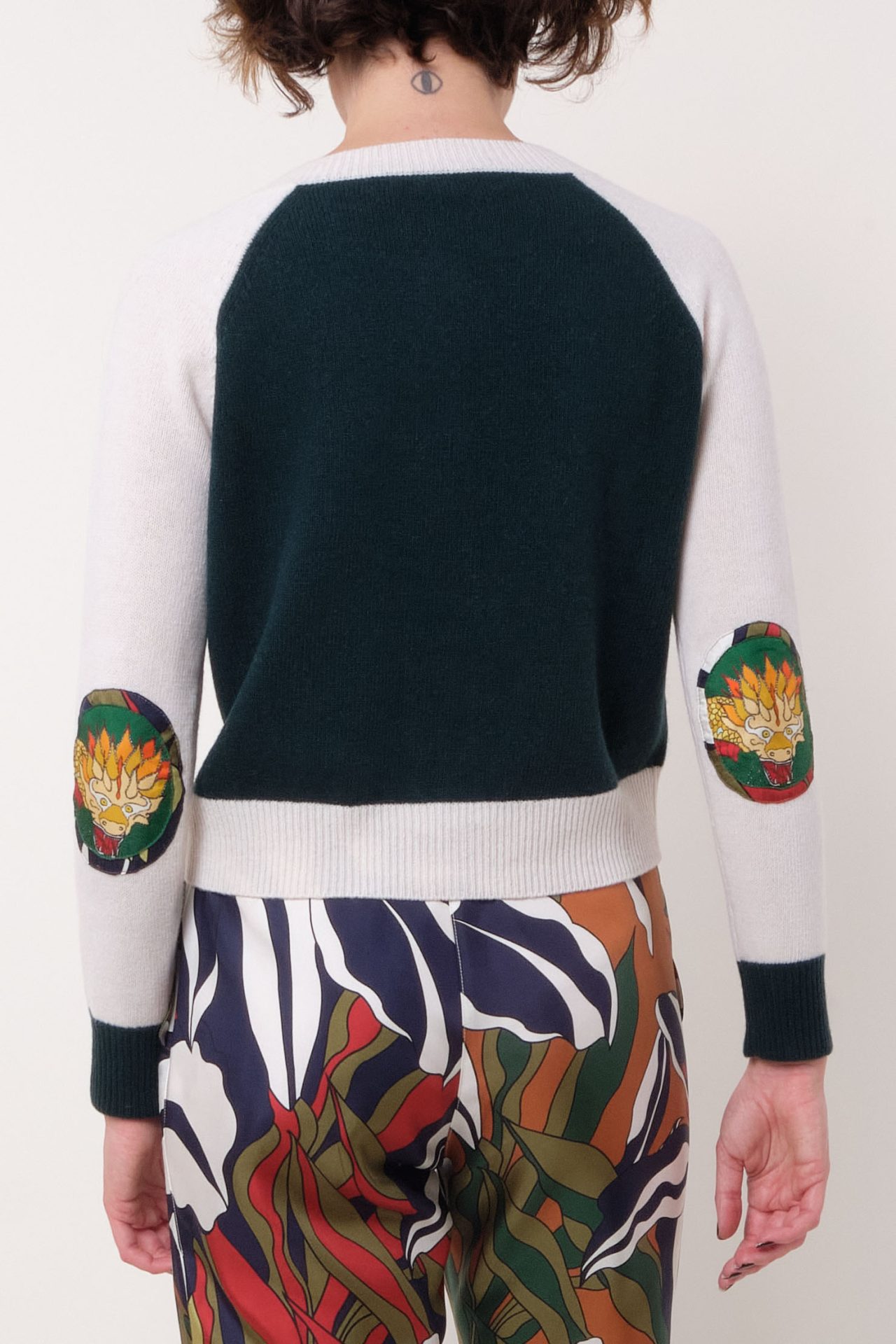 Long sleeved cardigan with rounded, button pad and elbow patches in silk twill, mother-of-pearl buttons. Green and Ecru colors.