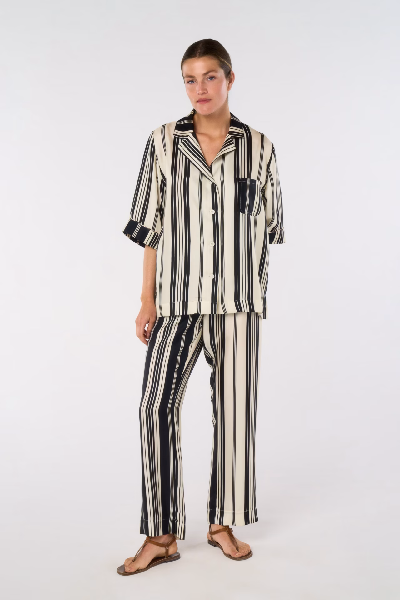Natural-rise straight pants with pockets and elastic belt, adjustable with inside buttons, fully in silk twill, horn buttons. Exclusive print “Mattress Stripes” in two colors.