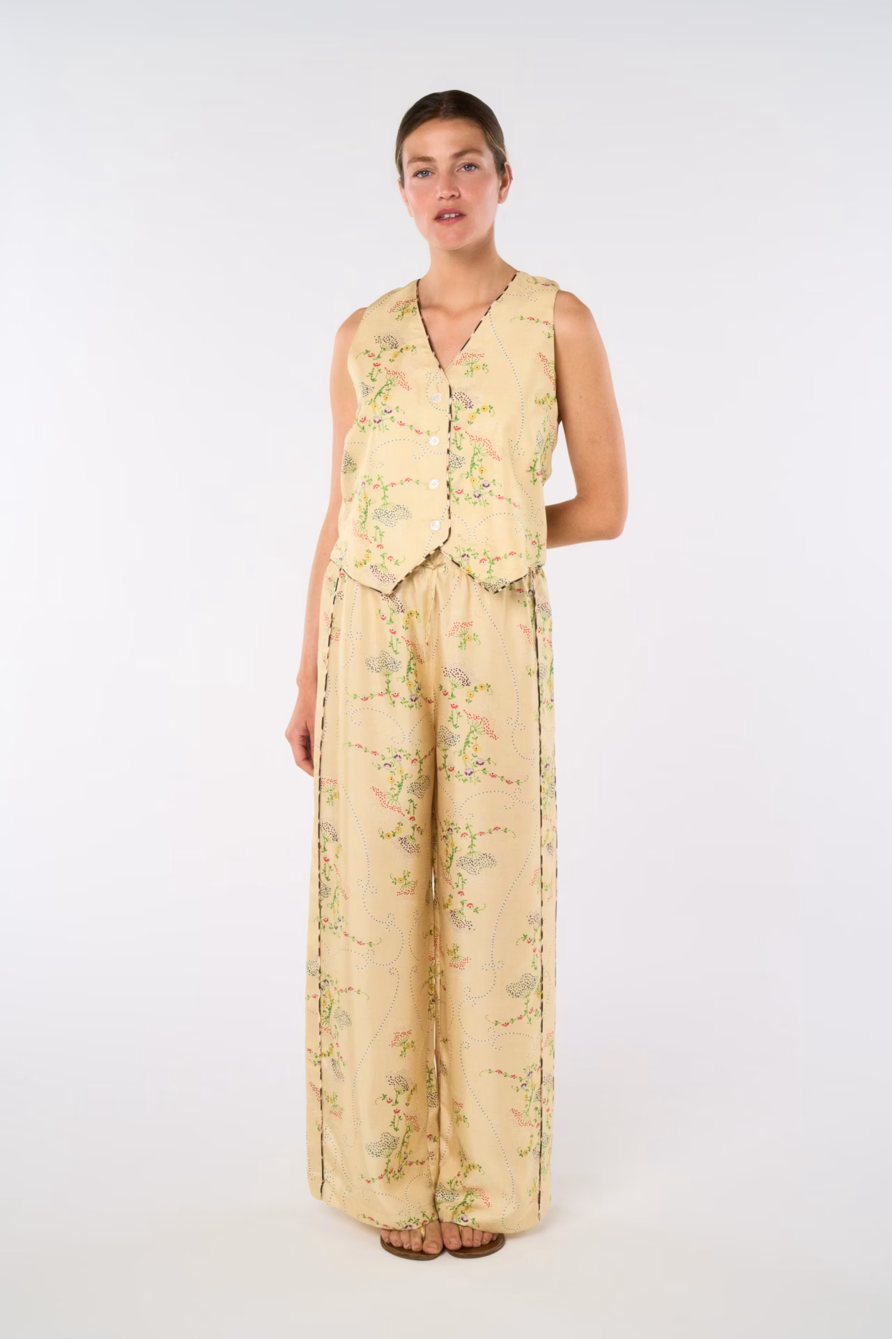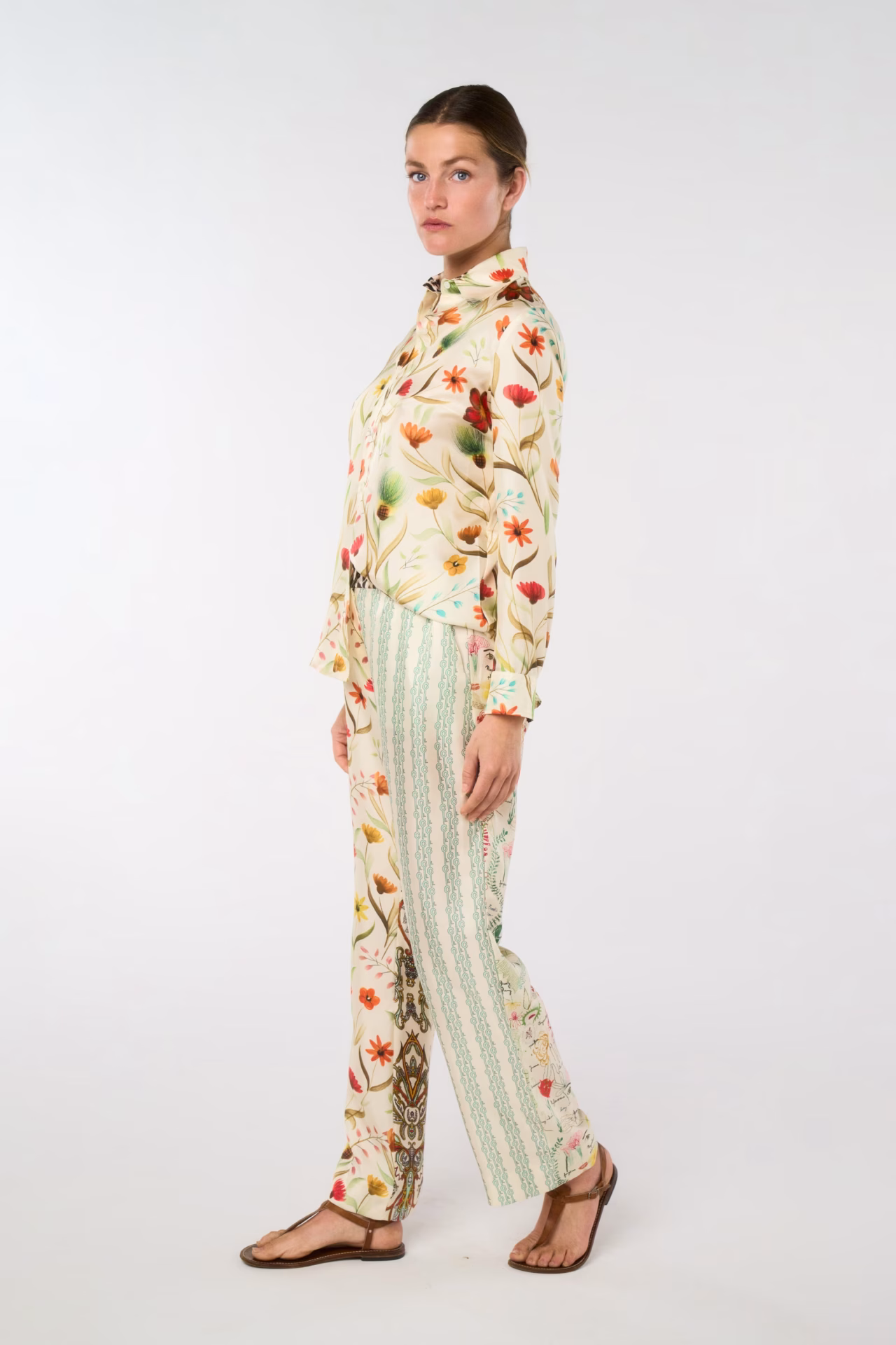 Natural-rise straight pants with pockets and elastic belt, adjustable with inside buttons, fully in silk twill, mother-of-pearl buttons. Exclusive prints “Clé Rayé” based on Laurence Kiberlain’s drawings, “Botanists” based on Audrey Demarre’s embroideries, “Watercolor”, “Calcutta” and “Panther”.