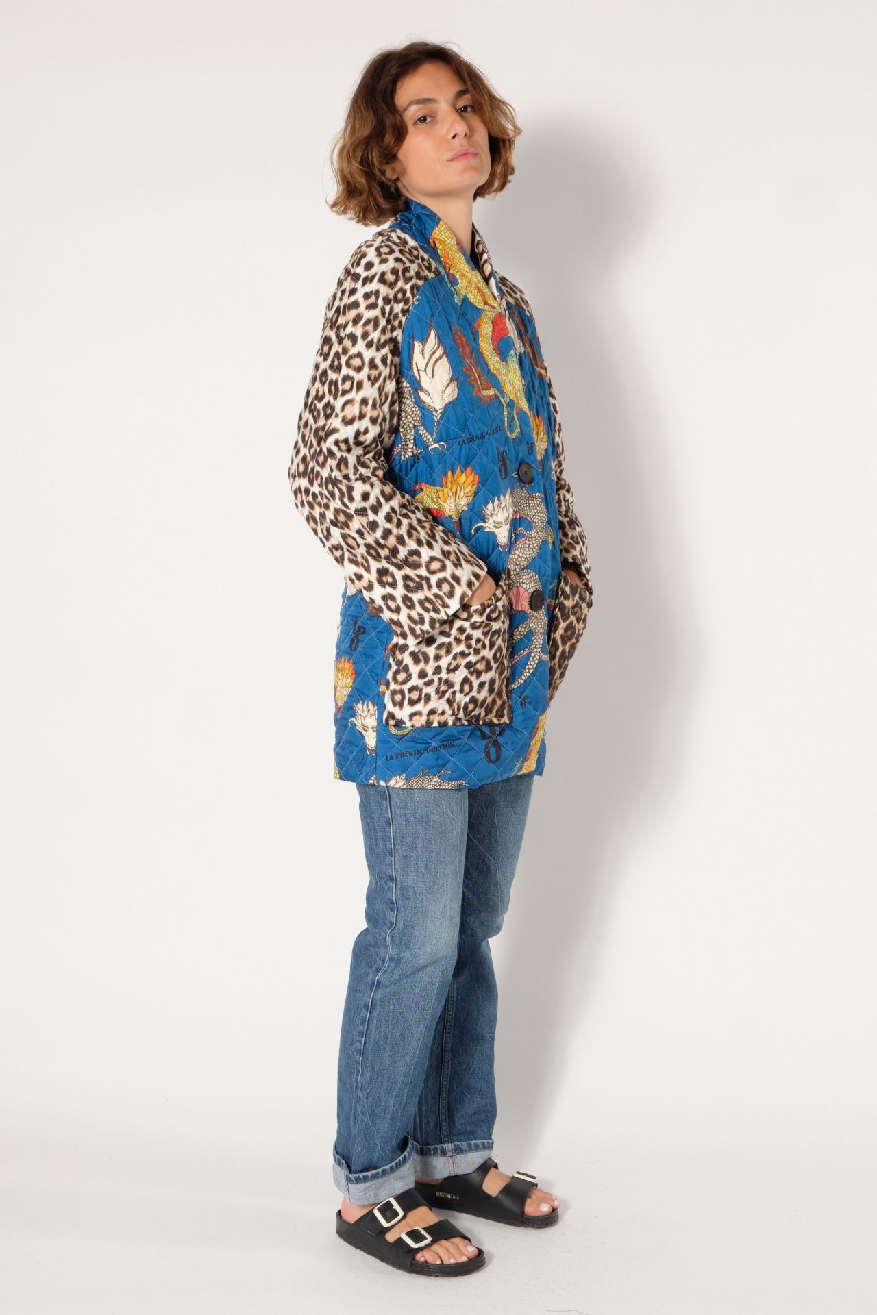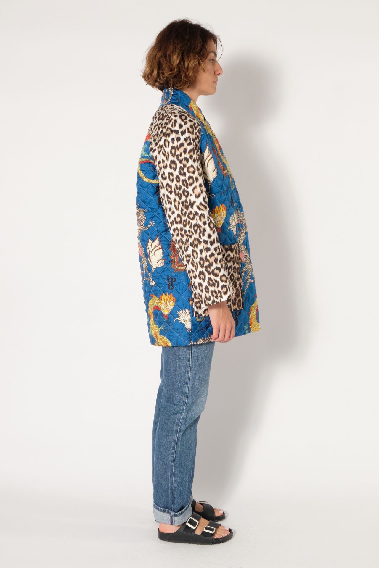 Peacoat in quilted silk twill, two horn button, raglan sleeves, two patched pockets. Exclusive prints “Dragons” based on Laurence Kiberlain’s drawings, and “Panther”.