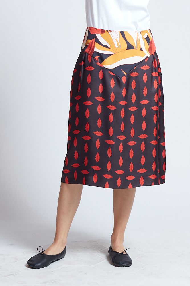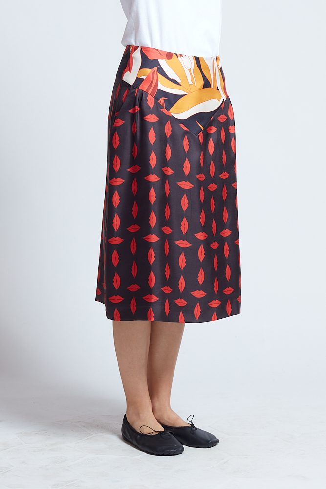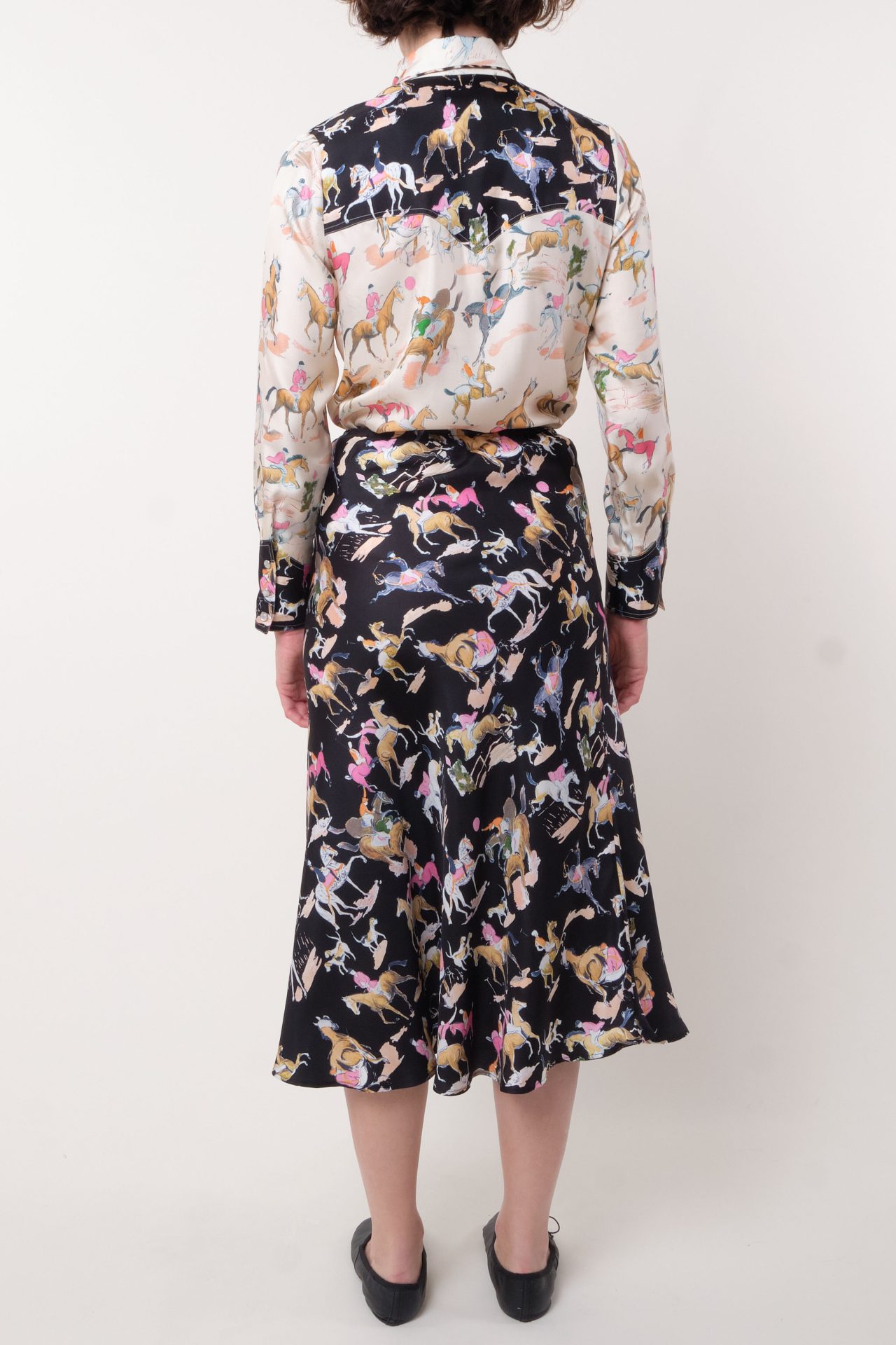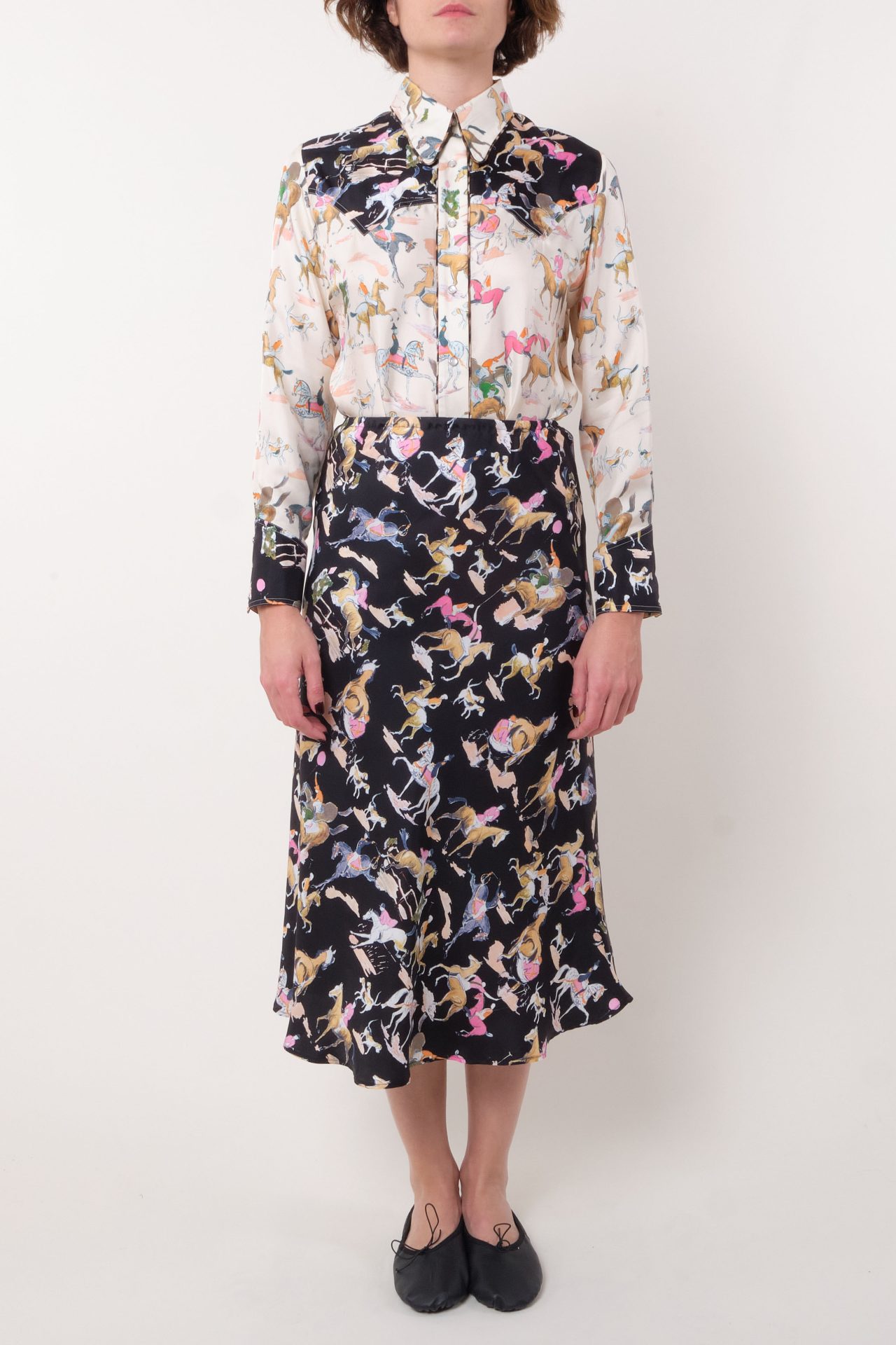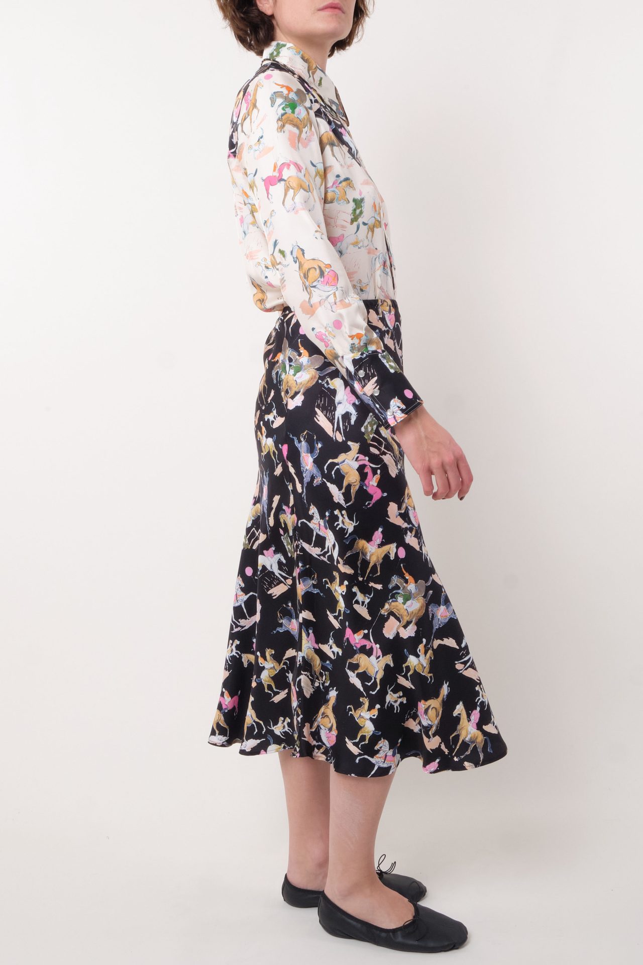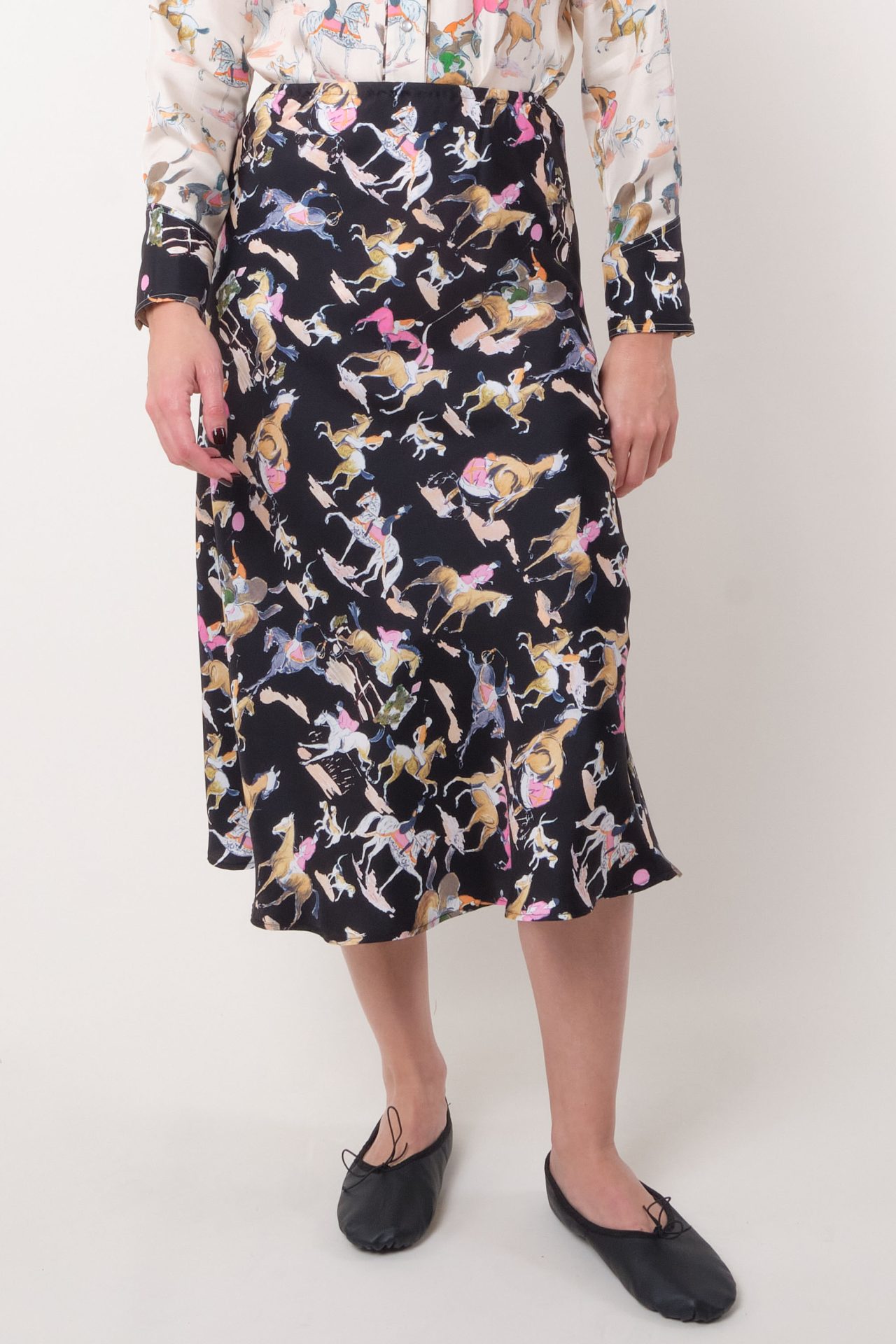 Flared midi skirt in bias-cut silk twill with an elastic waistband. Exclusive print “Cavallo”.