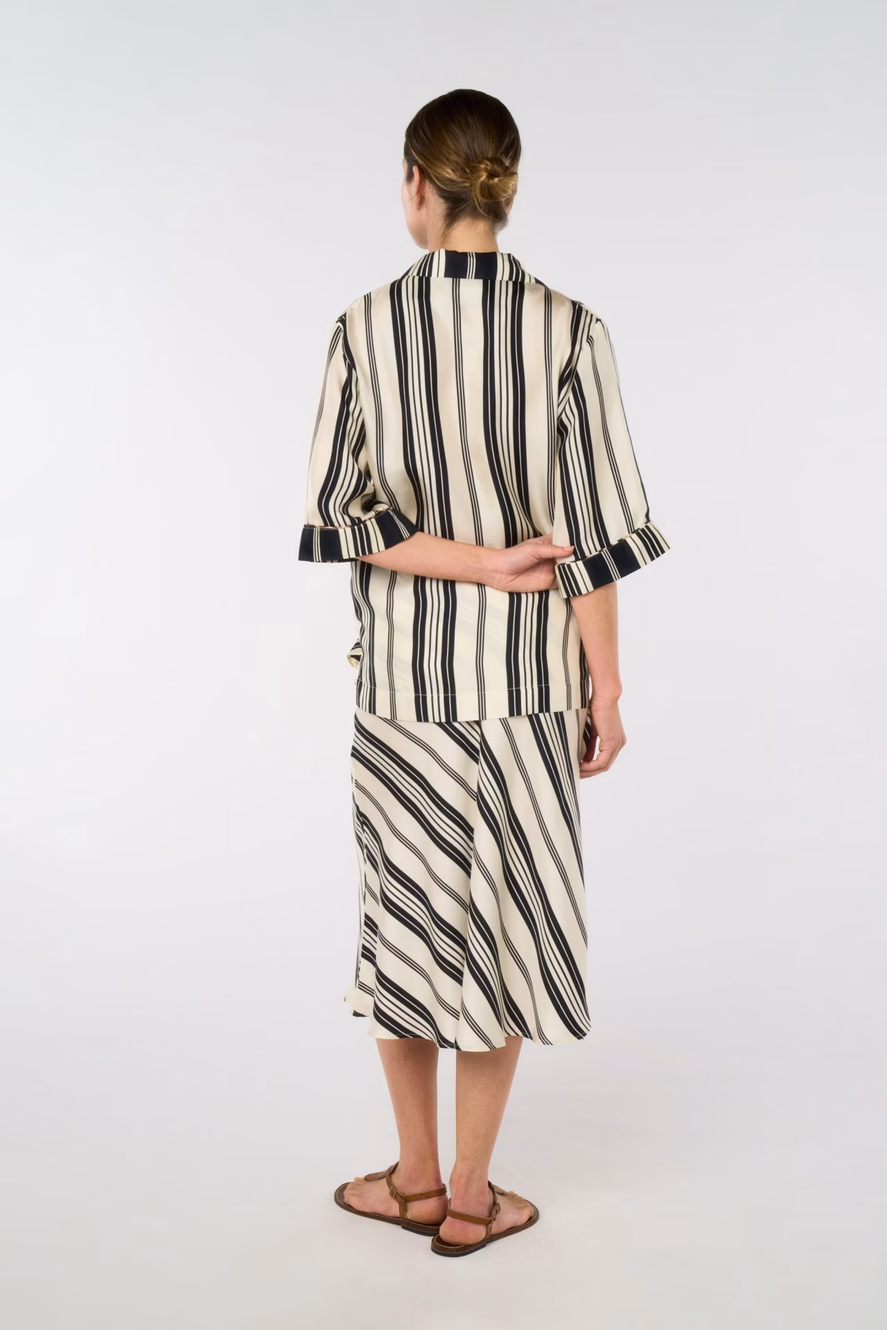 Flared midi skirt in bias-cut silk twill with an elastic waistband. Exclusive print “Mattress Stripes”.