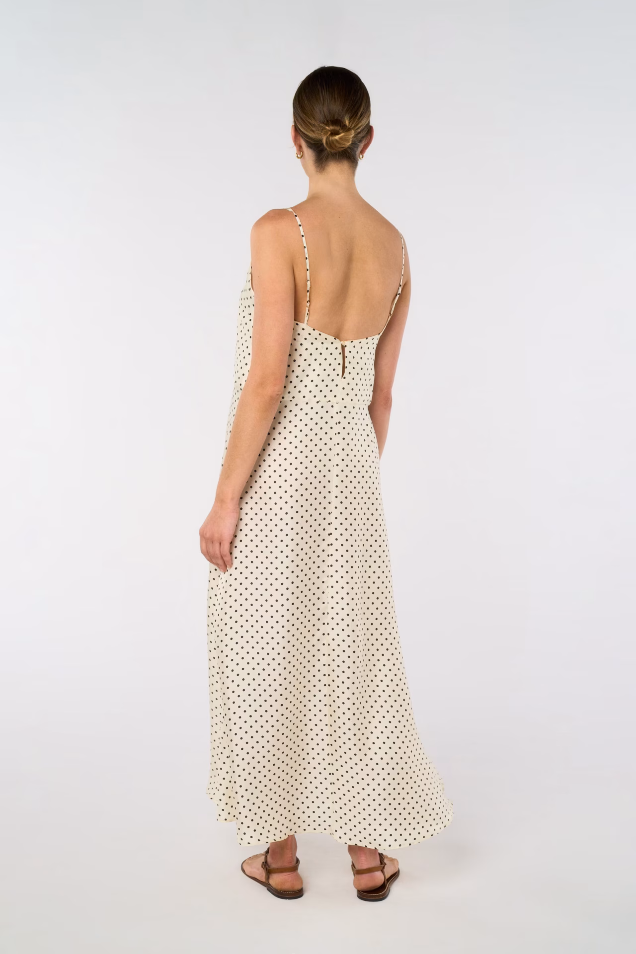 Sleeveless front open V-neck long dress, spaghetti straps, gold button on the back, fully in silk twill. Exclusive “Polka Dots” print.