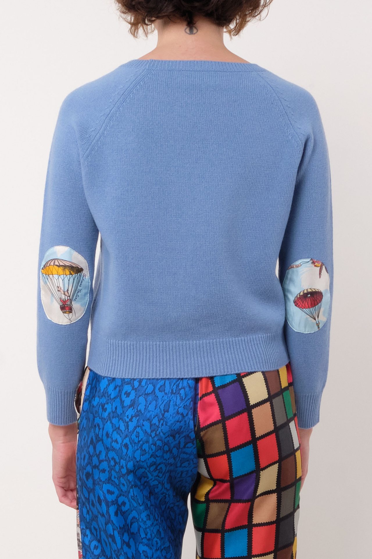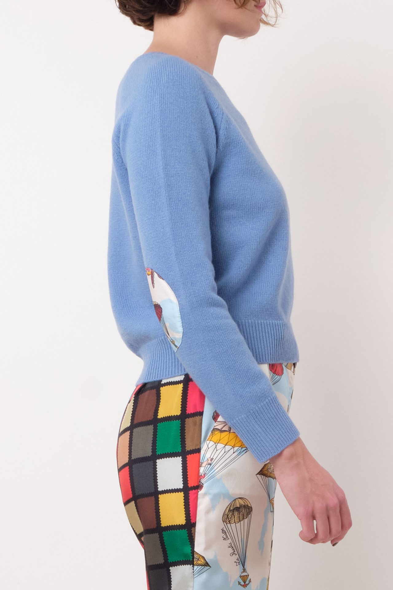Round-neck pullover in wool and cachemire. Elbow patches in silk twill.