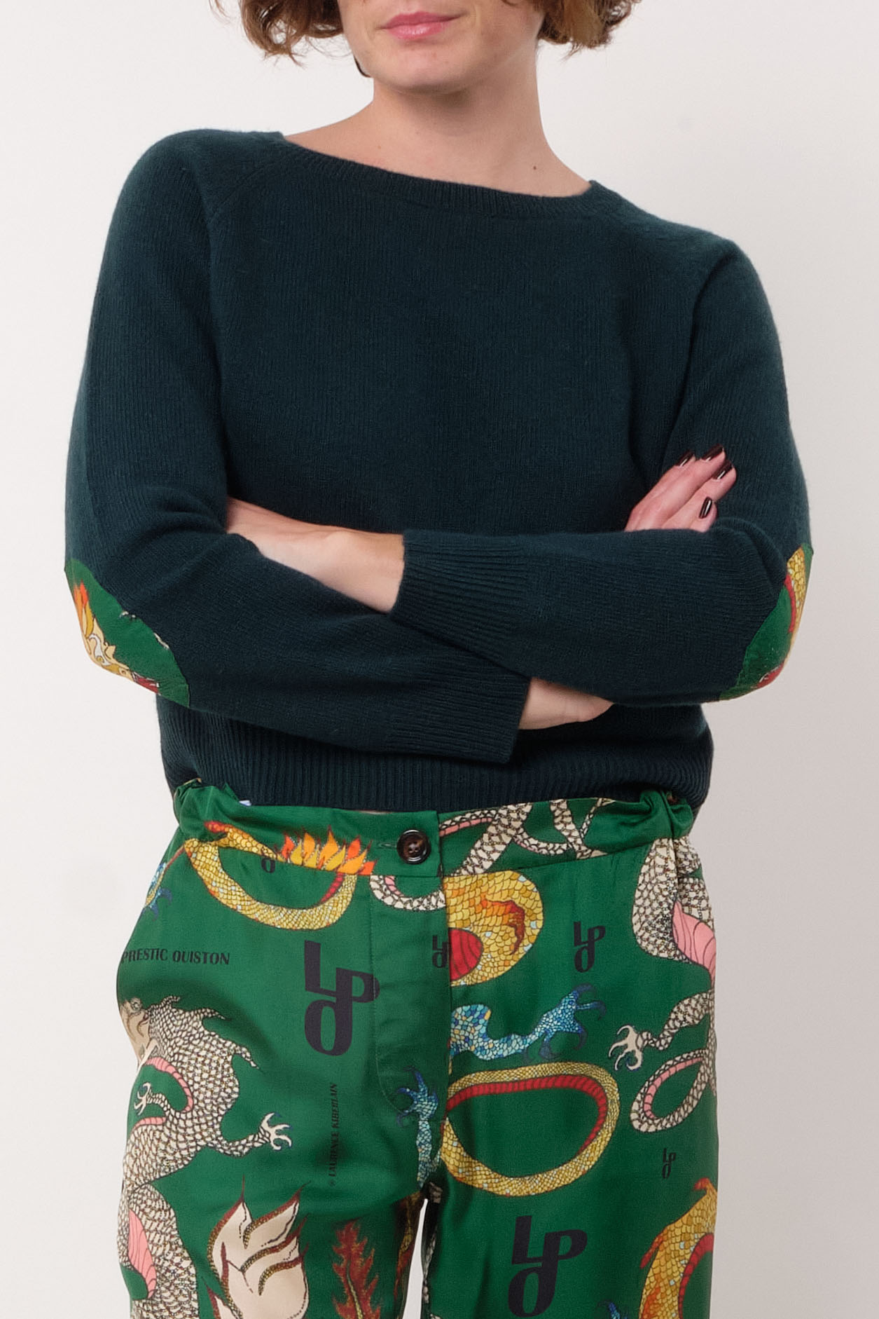 Round-neck pullover in wool and cachemire. Elbow patches in silk twill.