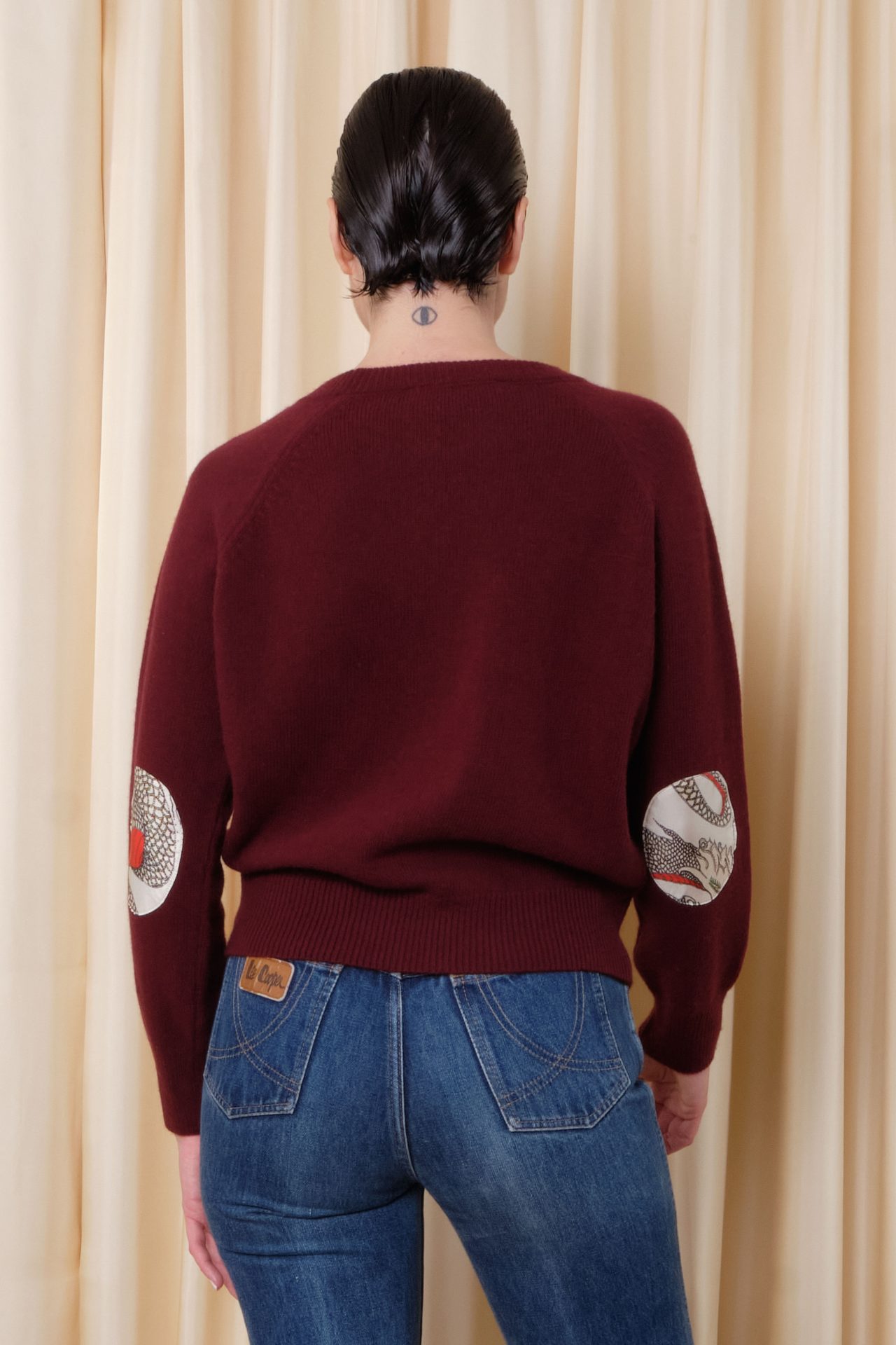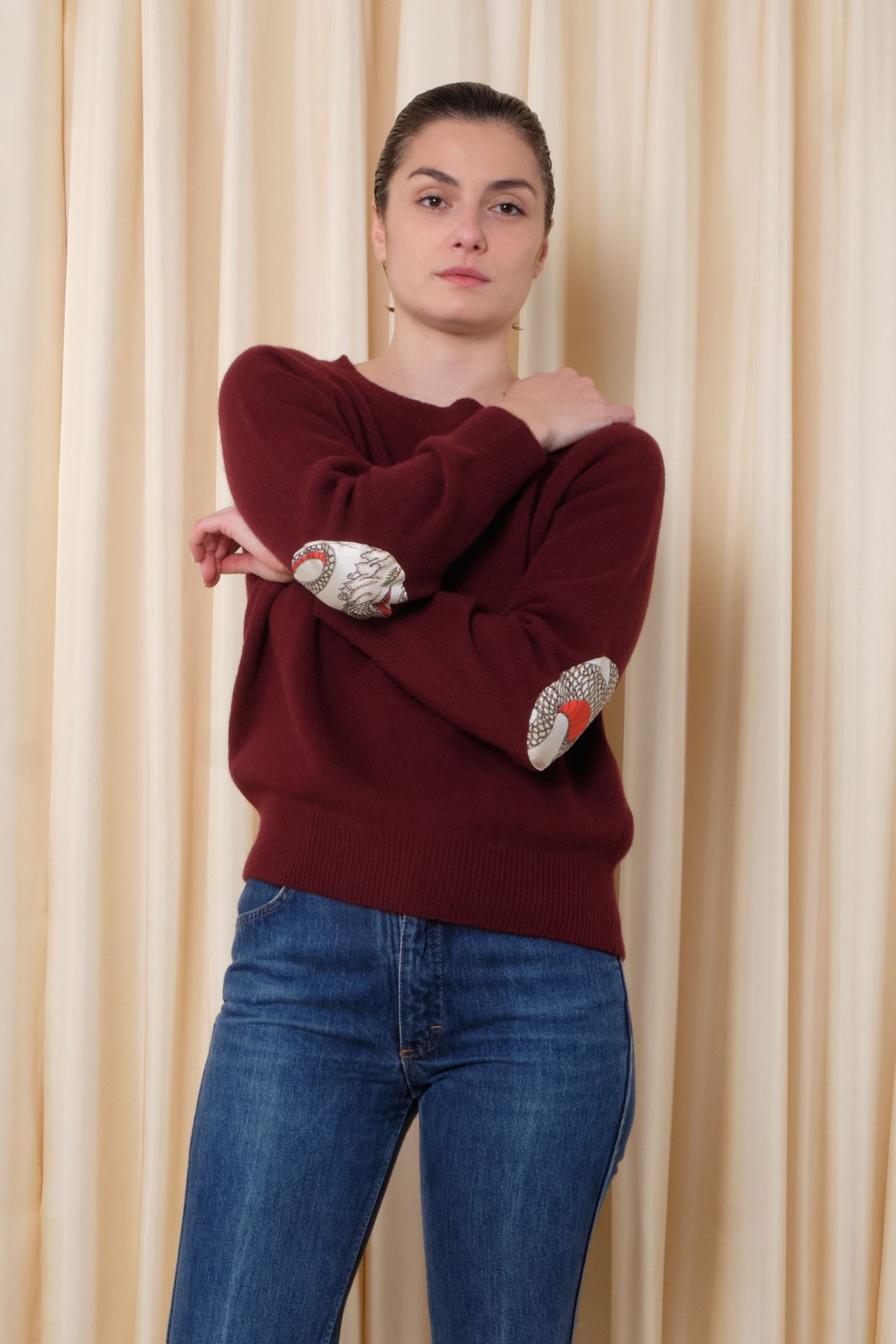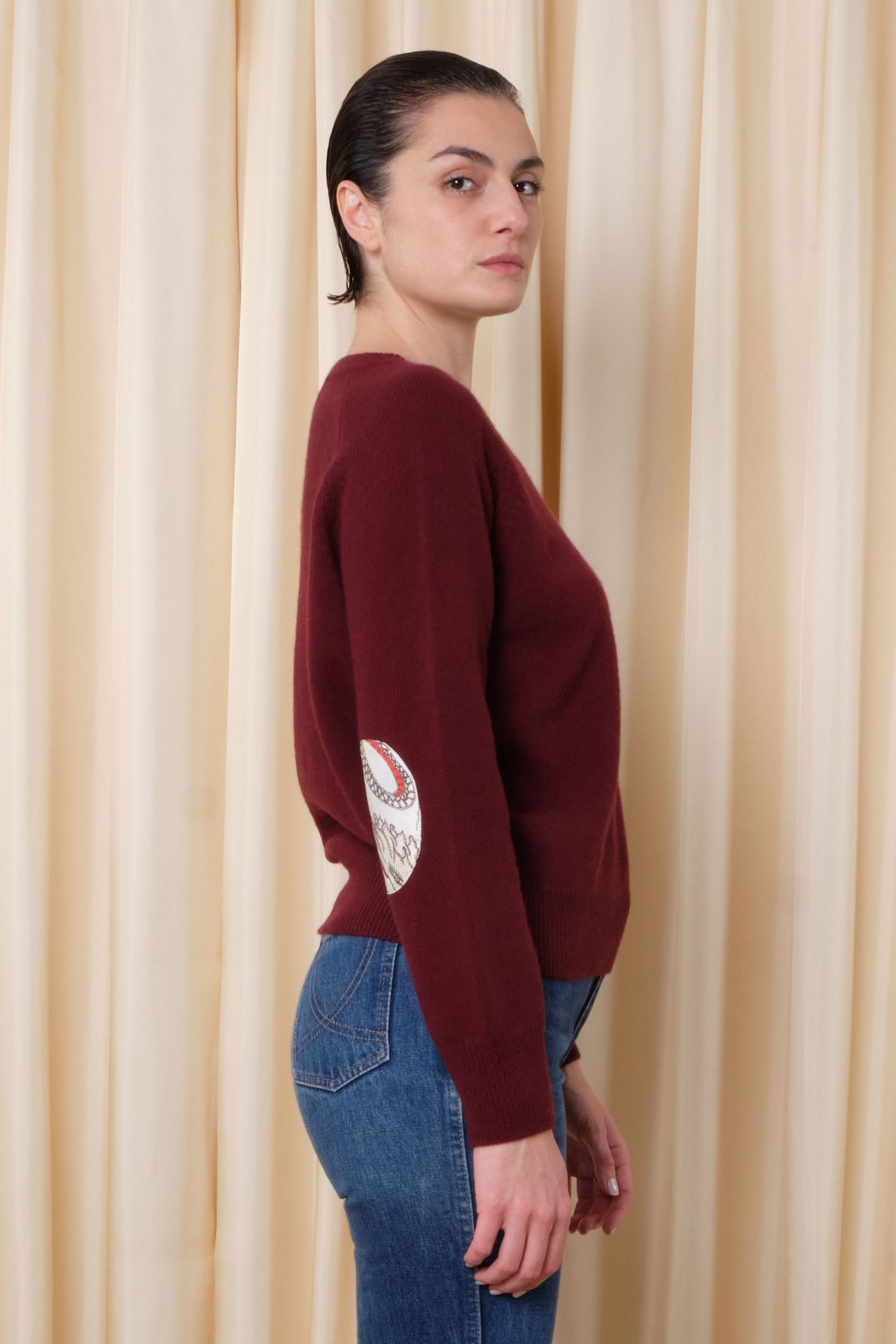 Round-neck pullover in pure wool. Elbow patches in silk.