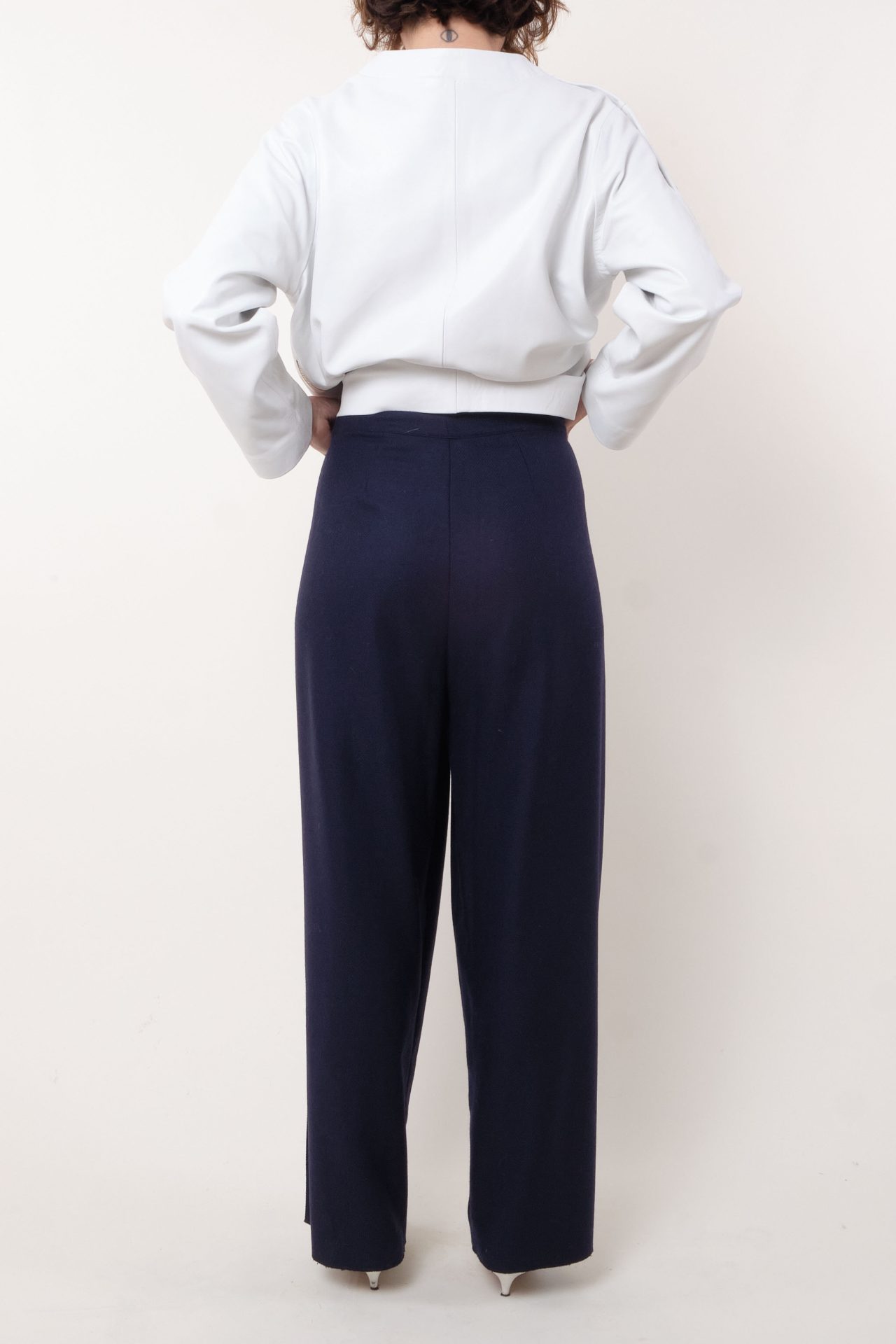 Straight pants in mix of cashmere and wool, pleated and stitched on the front, pockets in the seam, zip and mother-of-pearl button fastener.