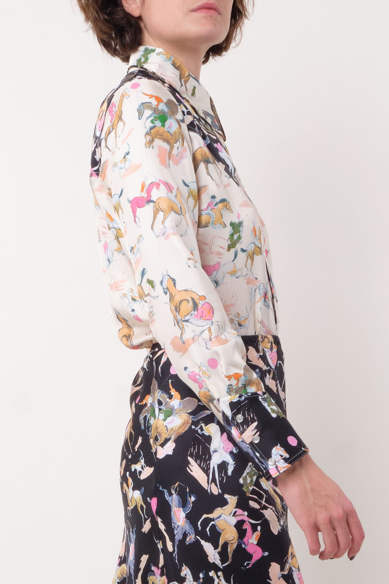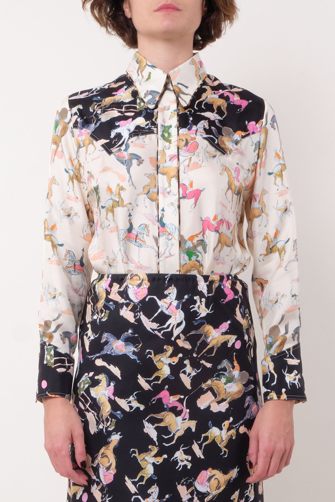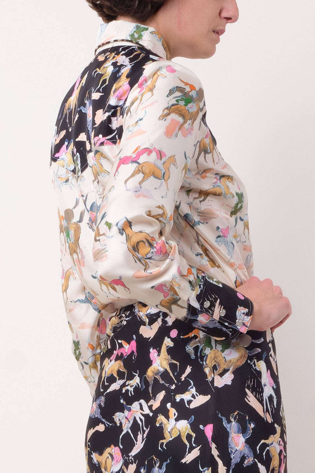 Long-sleeved shirt in silk twill, contrasted western style yokes and cuffs, piping details in Panther along button pad and collar, snap buttons. Exclusive print “Cavallo” in two colors.