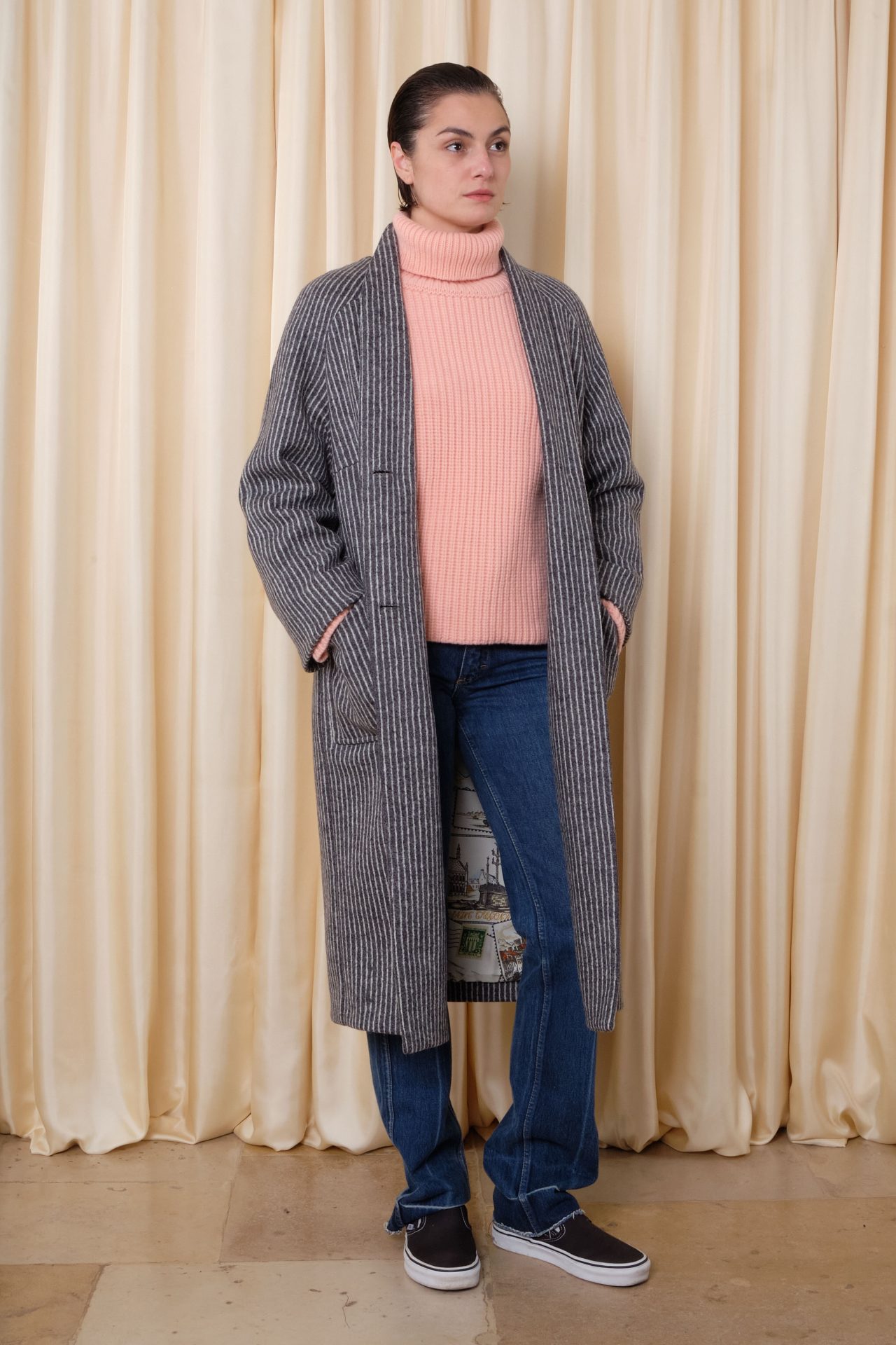 Manteau long en laine italienne, manches raglan, deux buttons, deux poches plaquées. Doublure en twill de soie, imprimé exclusif “Cartes postales”.
