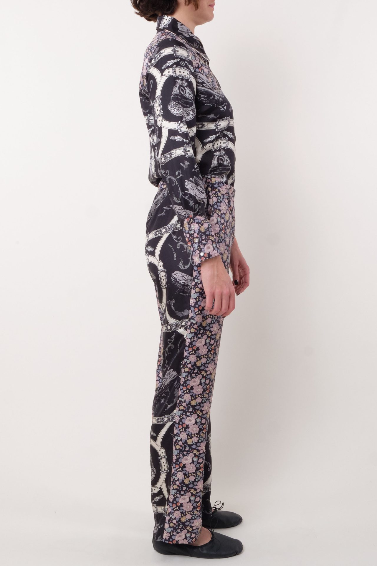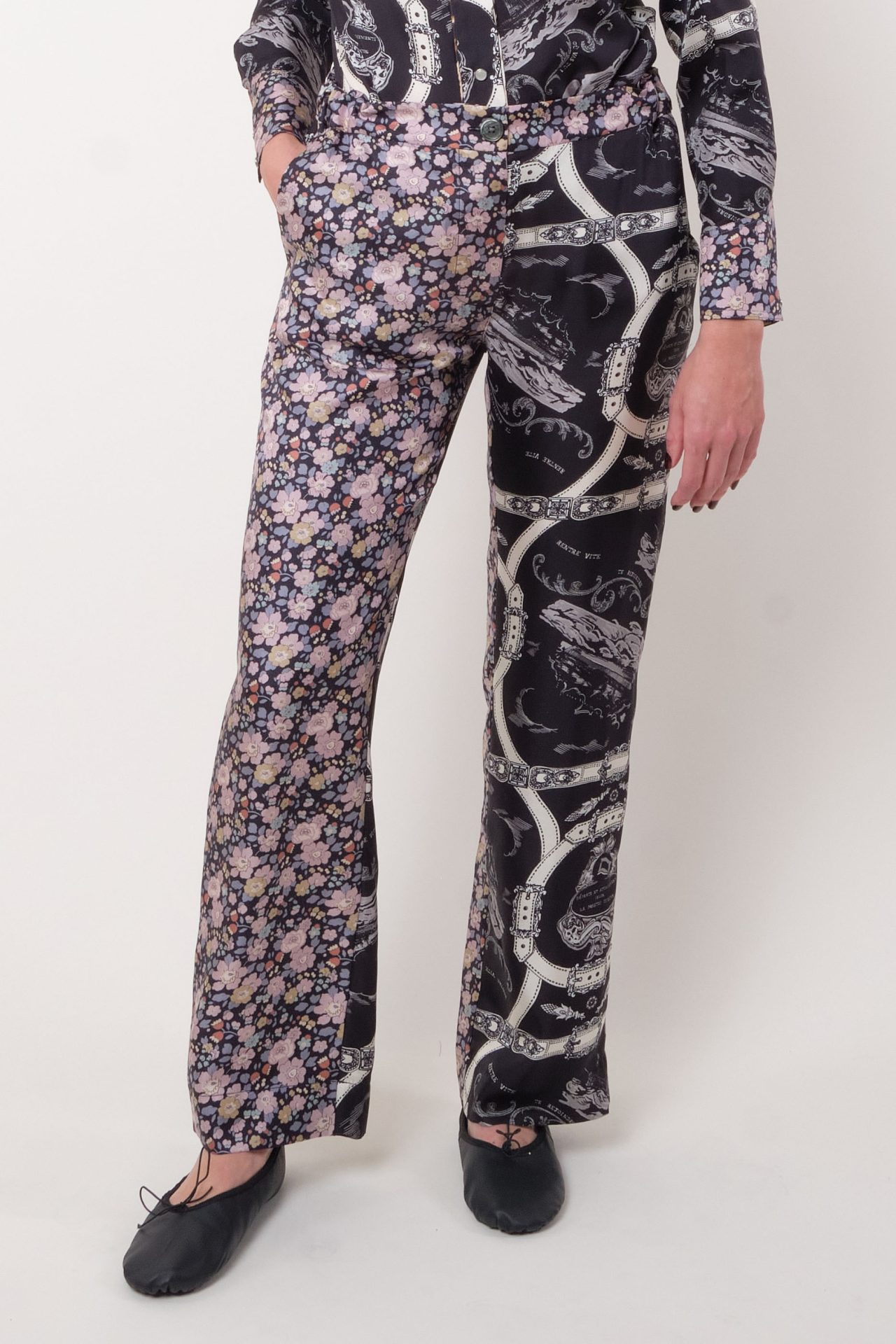 Pantalon droit en twill de soie, taille élastiquée réglable par deux boutons intérieurs, poches et fermeture par boutons en nacre. Imprimé “Betsy” de la Maison Liberty exclusivement sur twill de soie pour La Prestic Ouiston, et “Attachement”.