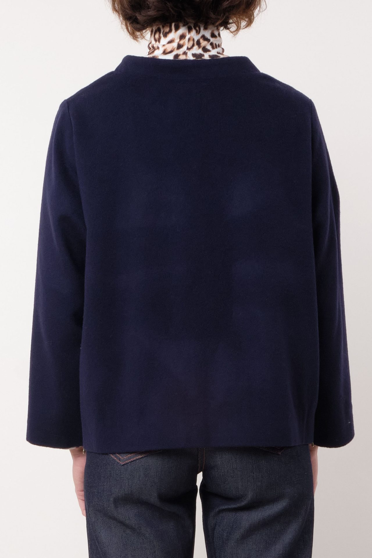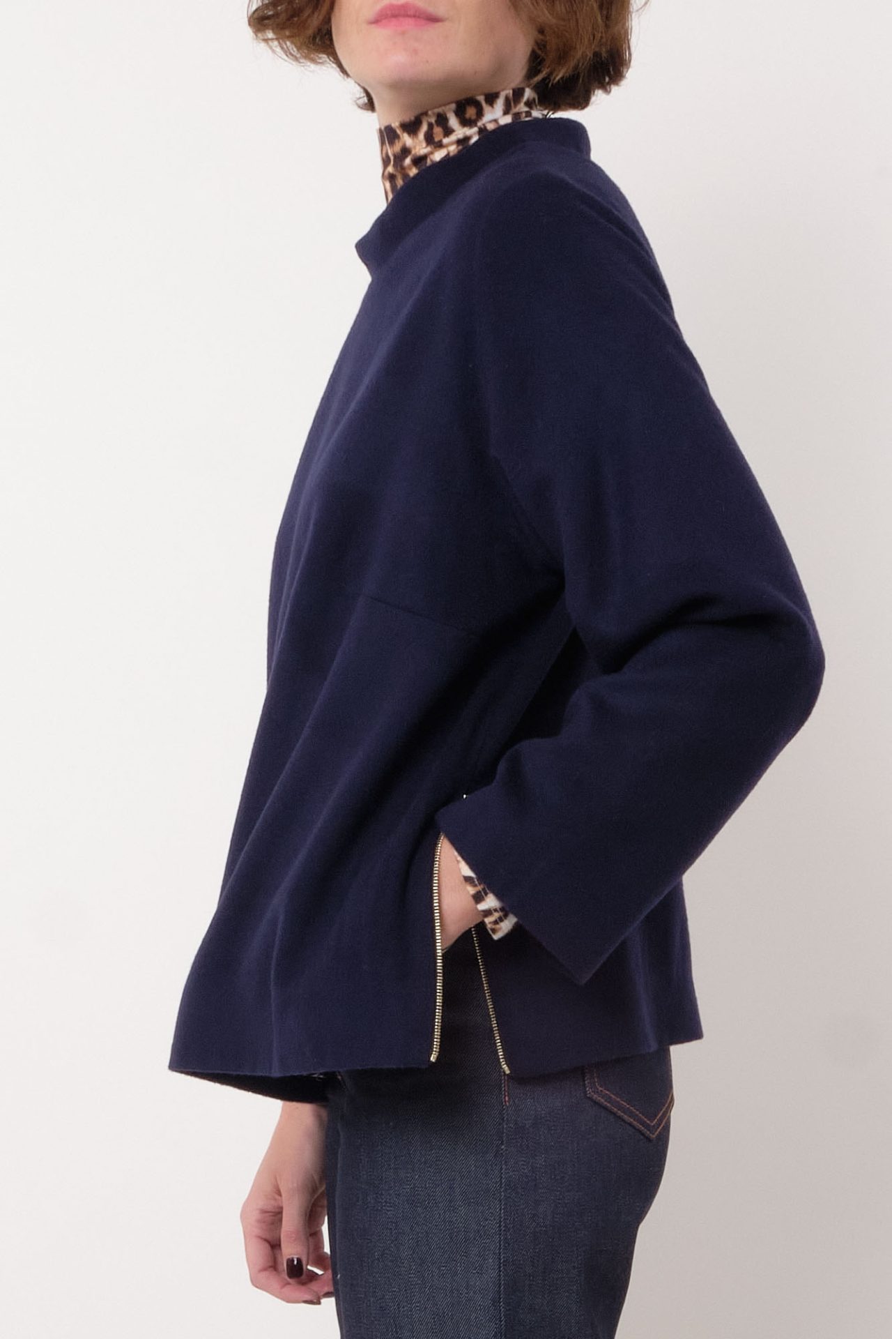 Top large en mélange de cachemire en laine à manches longues, doublé en twill de soie imprimé Panthère, col cheminée large, six boutons en métal noir à l’épaule droite, zippé sur les deux côtés, deux poches plaquées à l’intérieur de la doublure.