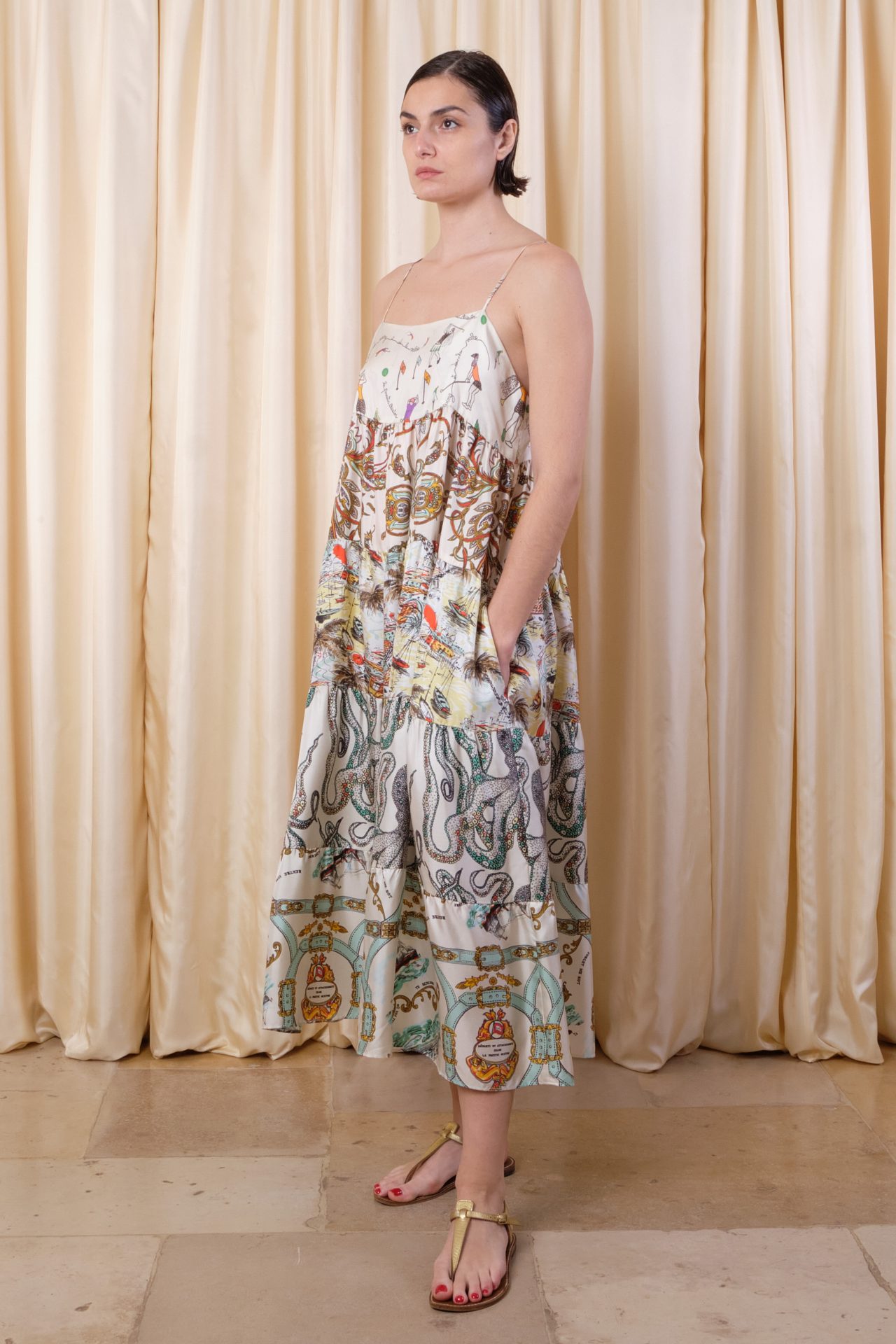Robe midi en twill de soie à cinq panneaux, à fines bretelles, un bouton doré au dos. Imprimés exclusifs “Golfeuses” et “Pieuvres” d’après les dessins de Laurence Kiberlain, “Calcutta”, “La Dolce Vita” et “Attachement”.