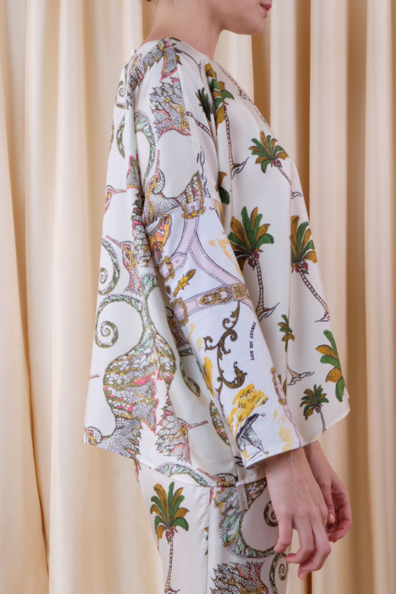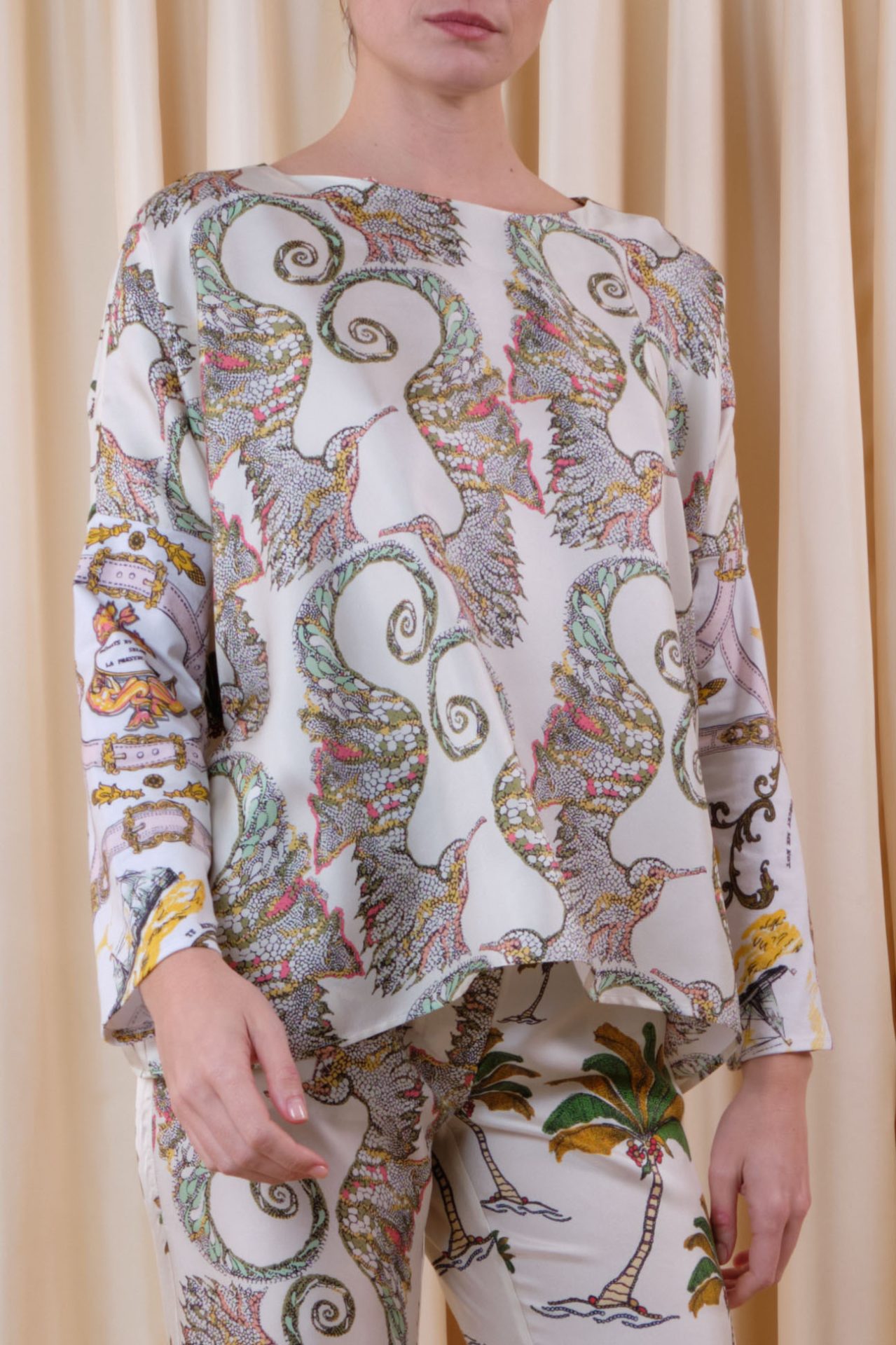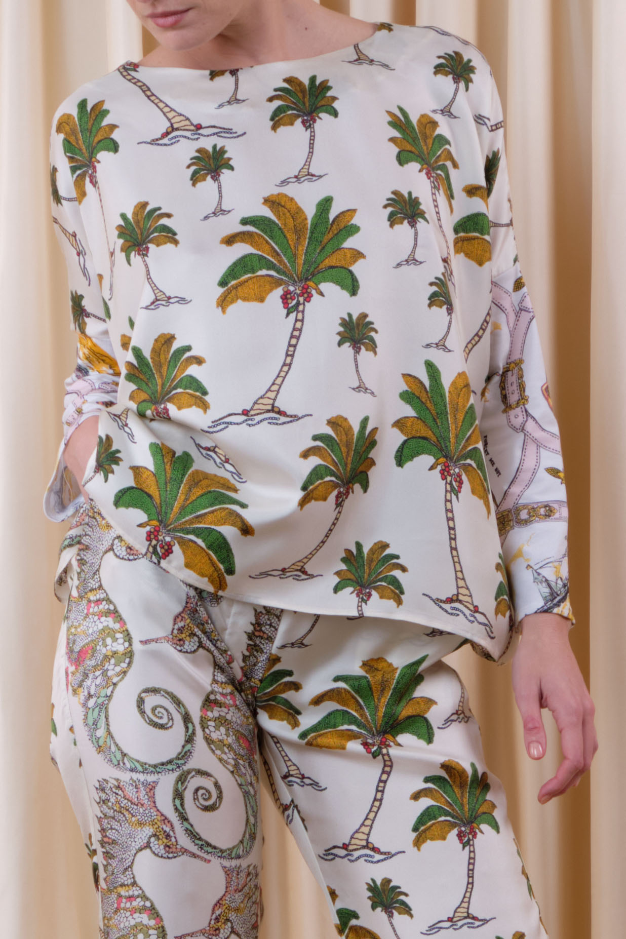 Top large, droit et biface en twill de soie, col rond et manches longues en jersey de viscose. Imprimés exclusifs “Hippocampes” et “Palmiers” d’après les dessins de Laurence Kiberlain, “Attachement” sur les manches. Peut se porter des deux côtés.