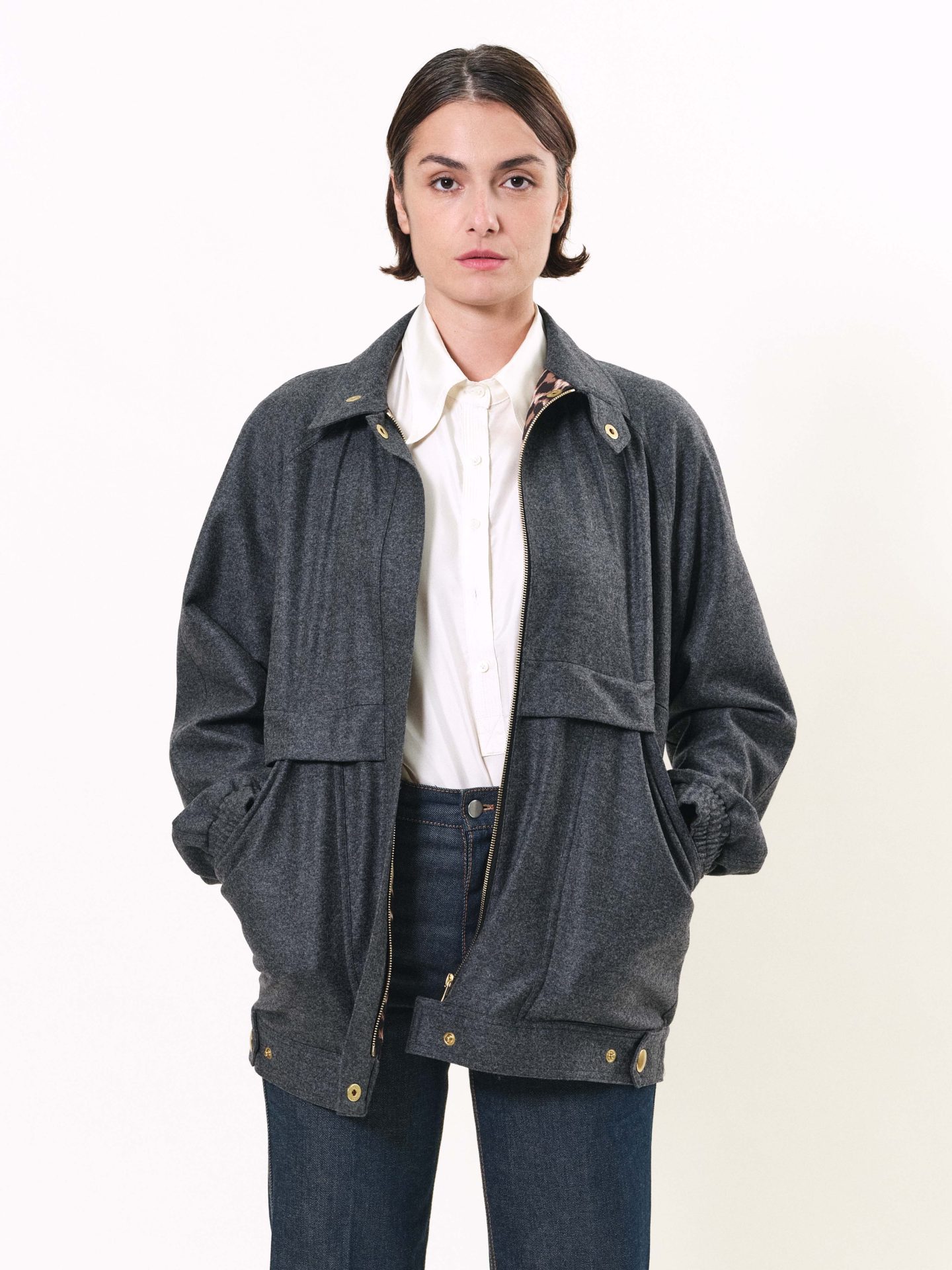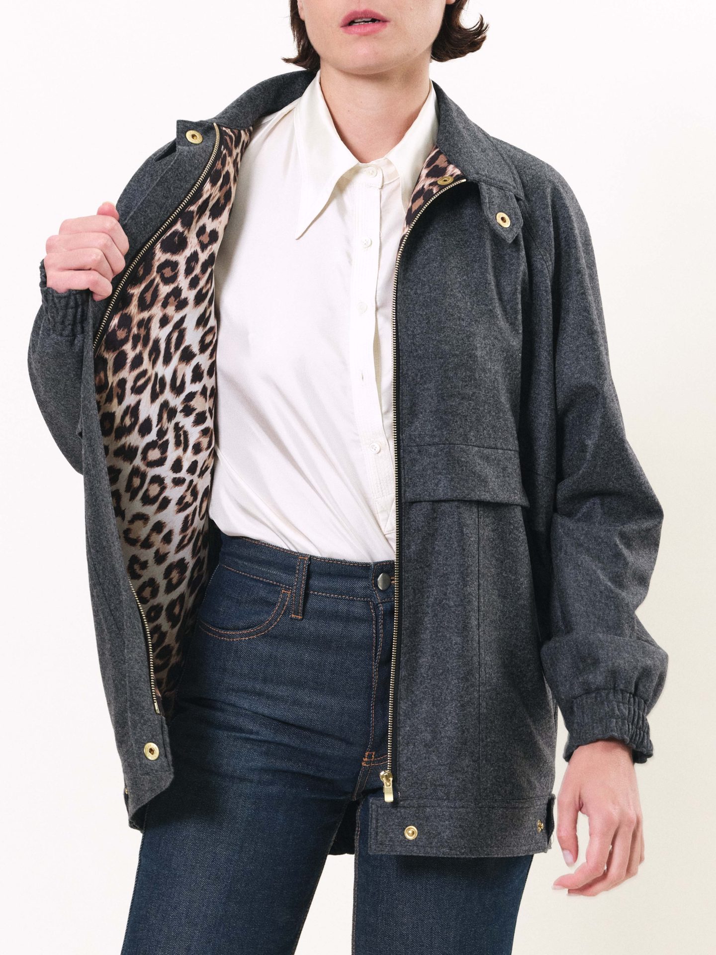 Veste zippée en laine, doublée en viscose, avec volants et poches, col montant. Couleur grise et en imprimé exclusif « Panthère » à l’intérieur.
