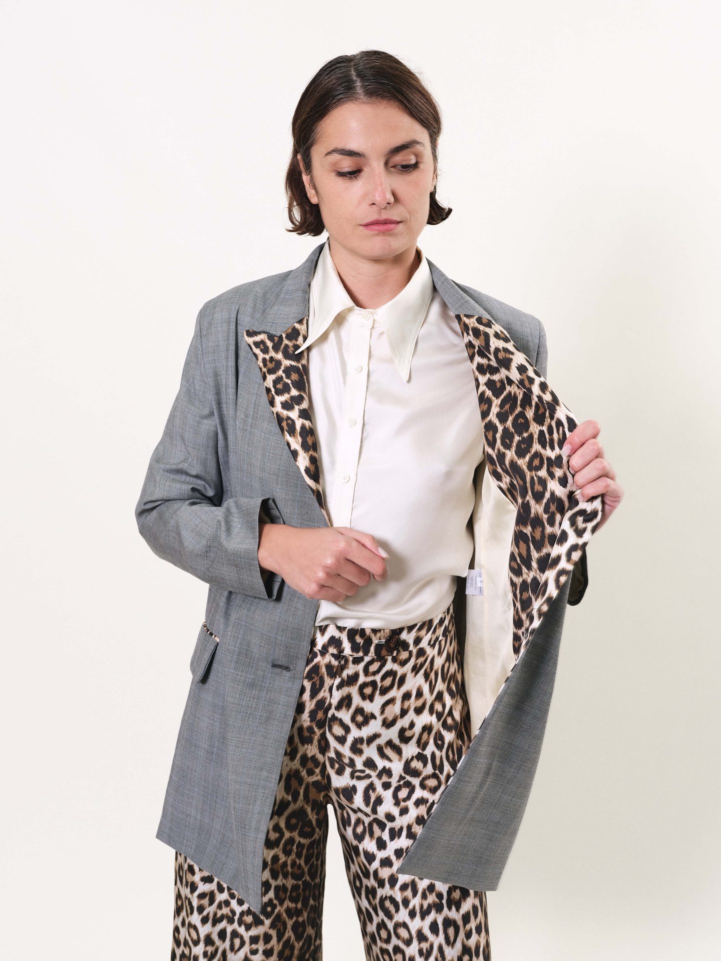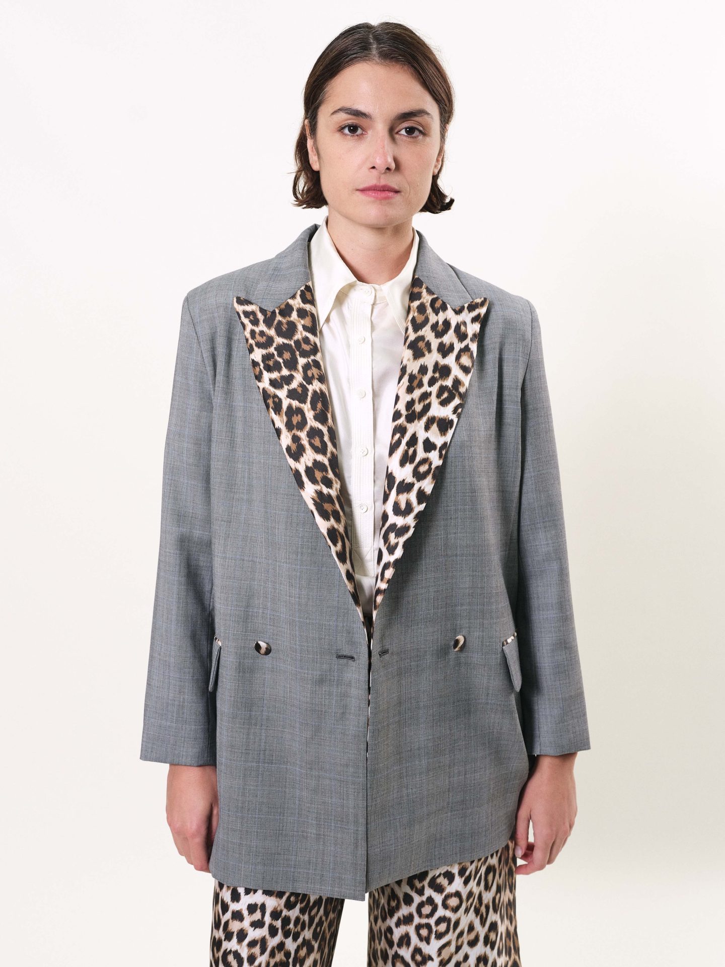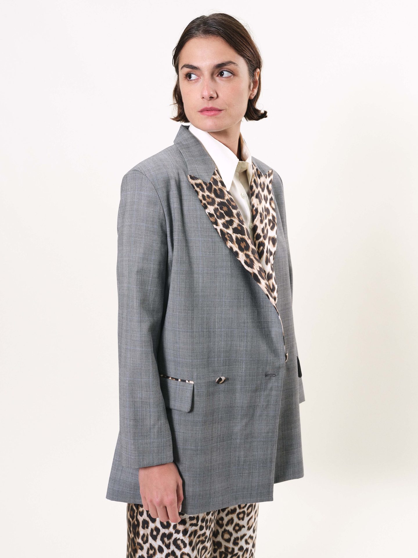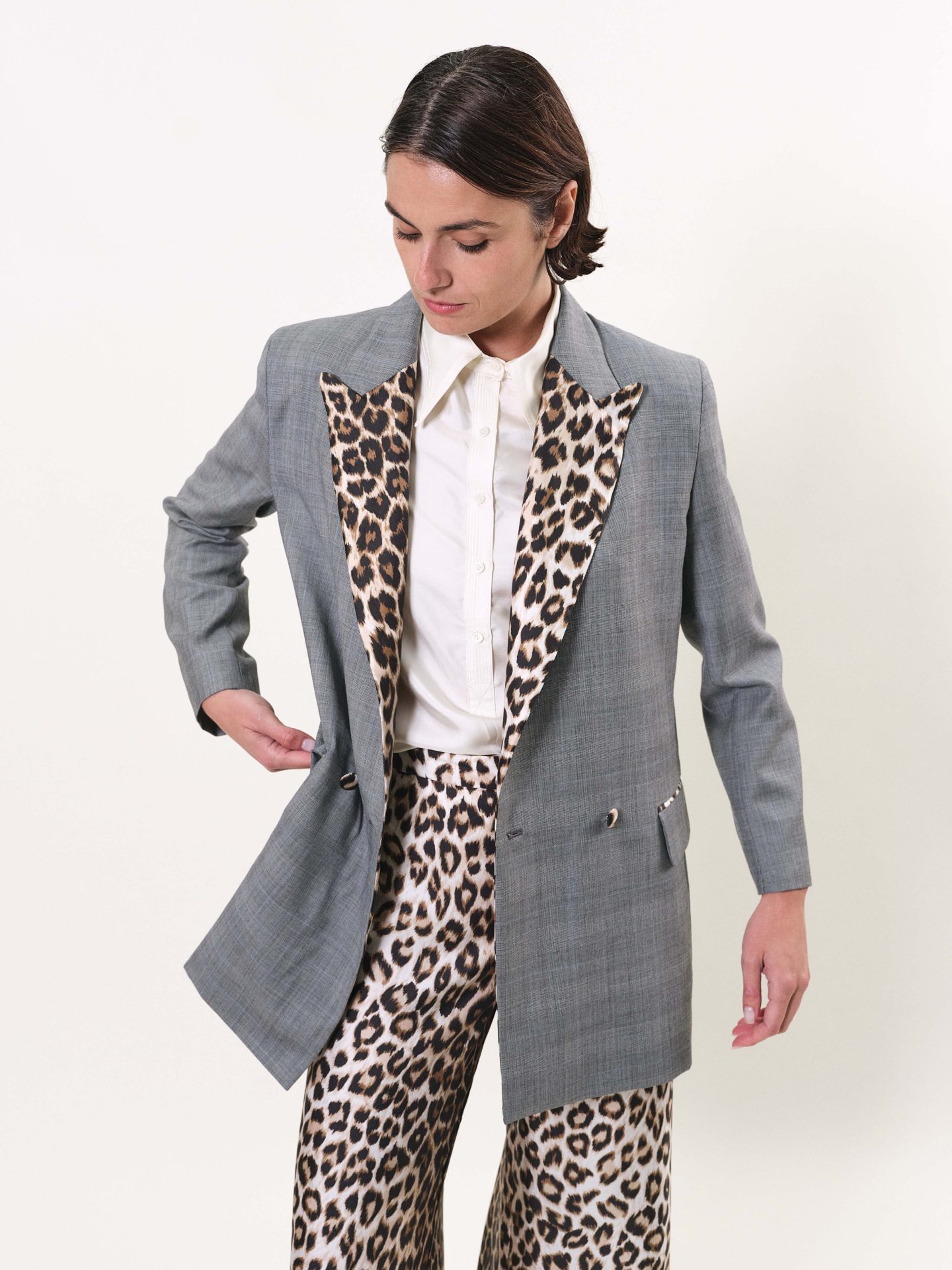 Veste longue croisée, deux boutons et col recouverts de soie “Panthère”, poches à rabat, doublure en twill de soie.